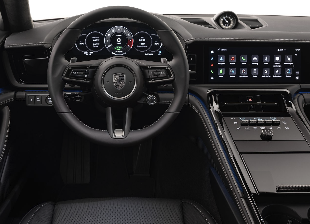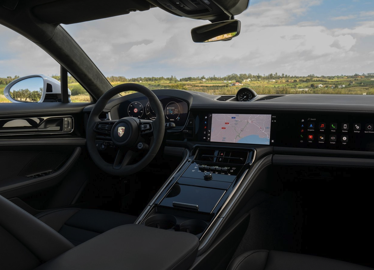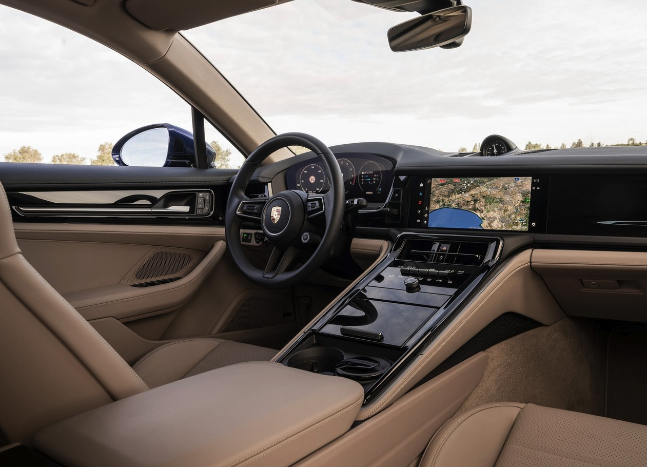 Stepping inside the Panamera 4 reveals a cabin that has been completely reimagined for the digital age. The “Porsche Driver Experience” layout places the focus squarely on the pilot, anchored by a stunning 12.6-inch curved digital instrument cluster that is both highly customizable and glare-free. The center console has been cleaned up significantly, moving the gear selector to the dashboard to create a more open, airy feel between the driver and passenger. Every surface is draped in premium materials, from fine leathers to brushed aluminum, ensuring that the tactile experience matches the car’s mechanical excellence.