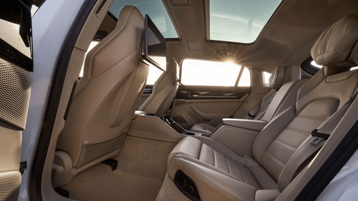 The Porsche Panamera 4 E-Hybrid retains its sleek, recognizable profile, with dimensions of 5,052 mm in length and a width of 1,937 mm. The redesigned window line and flush rear window emphasize the sedan’s streamlined look. Inside, the Porsche Driver Experience cockpit combines analog and digital controls. Essential driving functions are easily accessible through the steering wheel controls and nearby gear selector. An optional passenger display adds to the tech experience, offering performance data, entertainment controls, and video streaming.