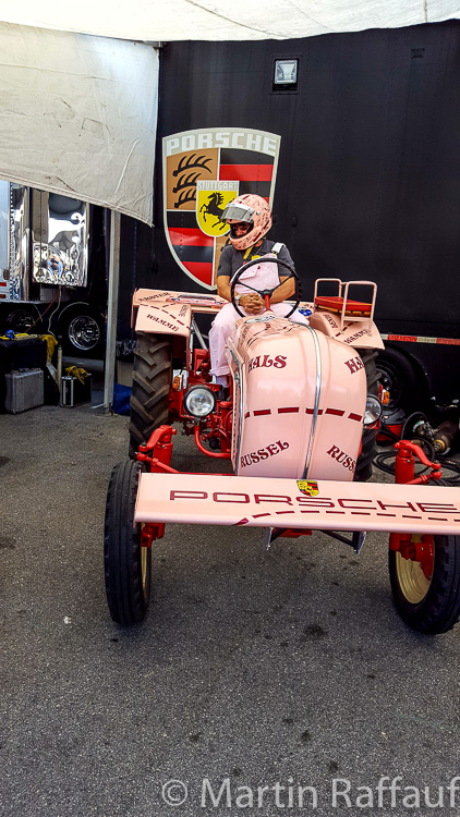 The Porsche tractor race was a big hit with fans. There was a Le Mans start on the start/finish straight and the tractors ‘raced’ over to turn 5 at Laguna Seca. Thank goodness, they did not make them navigate the corkscrew! The Gunnar tractor however had a big handicap, as it was dragging around a cart with a bunch of small kiddie tractors, all painted up in the ‘Pink Pig’ 917-20 paint scheme. John Oates (of the rock group Hall & Oates) drove this tractor on Saturday, and Justin Bell drove it on Sunday. Although we did not win, the Gunnar tractor did win the award for best tractor! Kevin Jeannette had once again hit a home run with his tractor preparation!