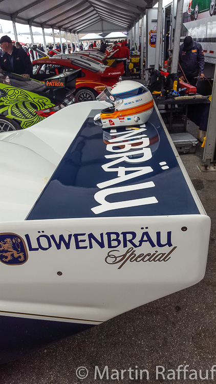 In the 962 category, we had the Holbert Lowenbrau chassis 962-HR1 (first Holbert Racing car built at Holbert’s in Pennsylvania). Kevin Doran (crew chief at Holbert in 1985-1987) was on hand to manage this car and Derek Bell drove it. It ran pretty much faultlessly, and all we did was add fuel, and check the tyre pressures and oil level. Derek seemed to enjoy himself as he ran in all the sessions except one, when he and Alwin Springer did a tribute on stage to the late Al Holbert, which was well done and well received. David Donohue shuttled between 962-106 (a BFG IMSA car with single turbo), and 962-123 (a twin-turbo water-cooled car). Justin Bell drove the Kremer K8 (a 962-based Kremer built car) that won the Daytona 24 hours in 1996, until the engine had a problem on Saturday. So, he was then shifted across to drive in the Porsche tractor race on Sunday.
