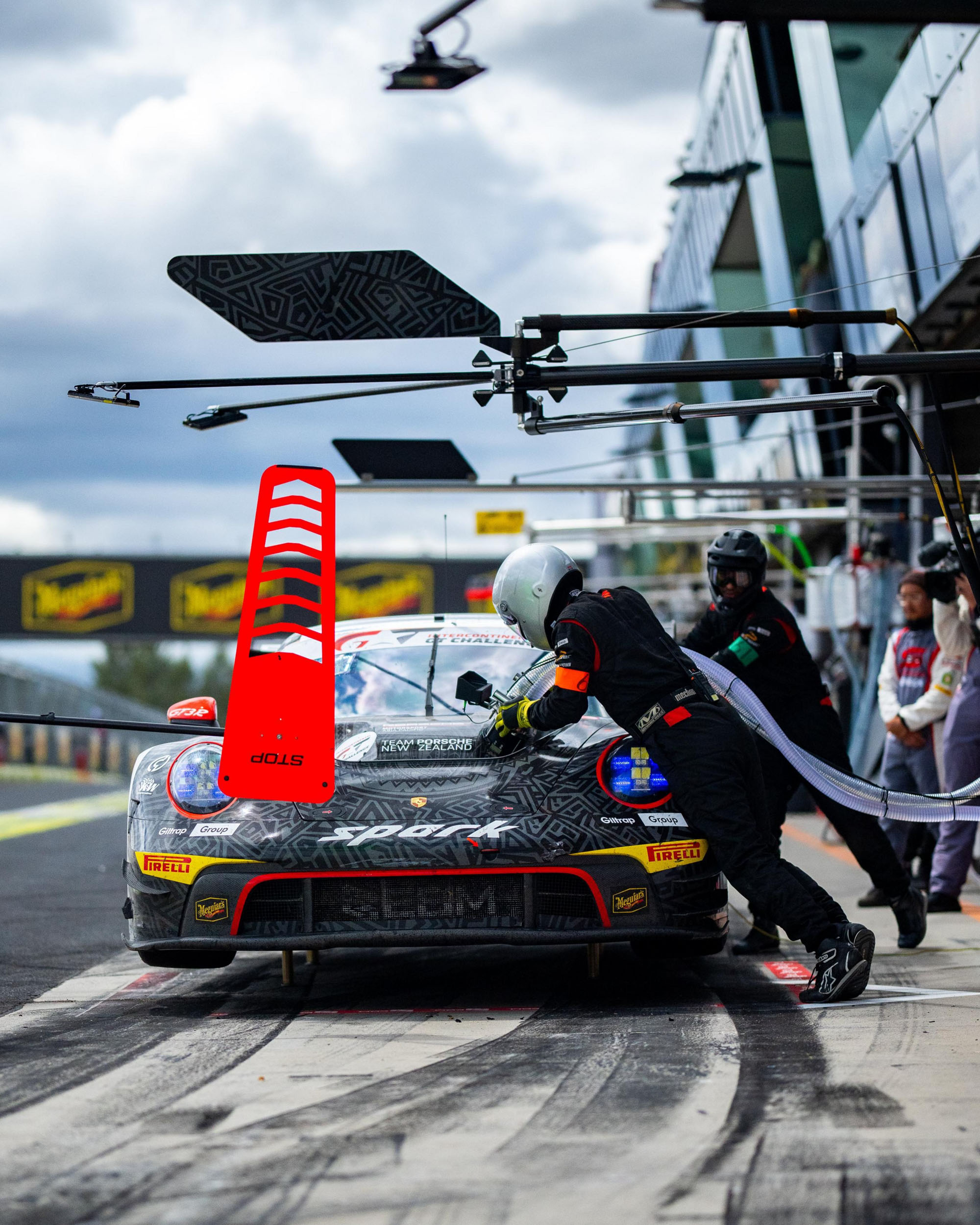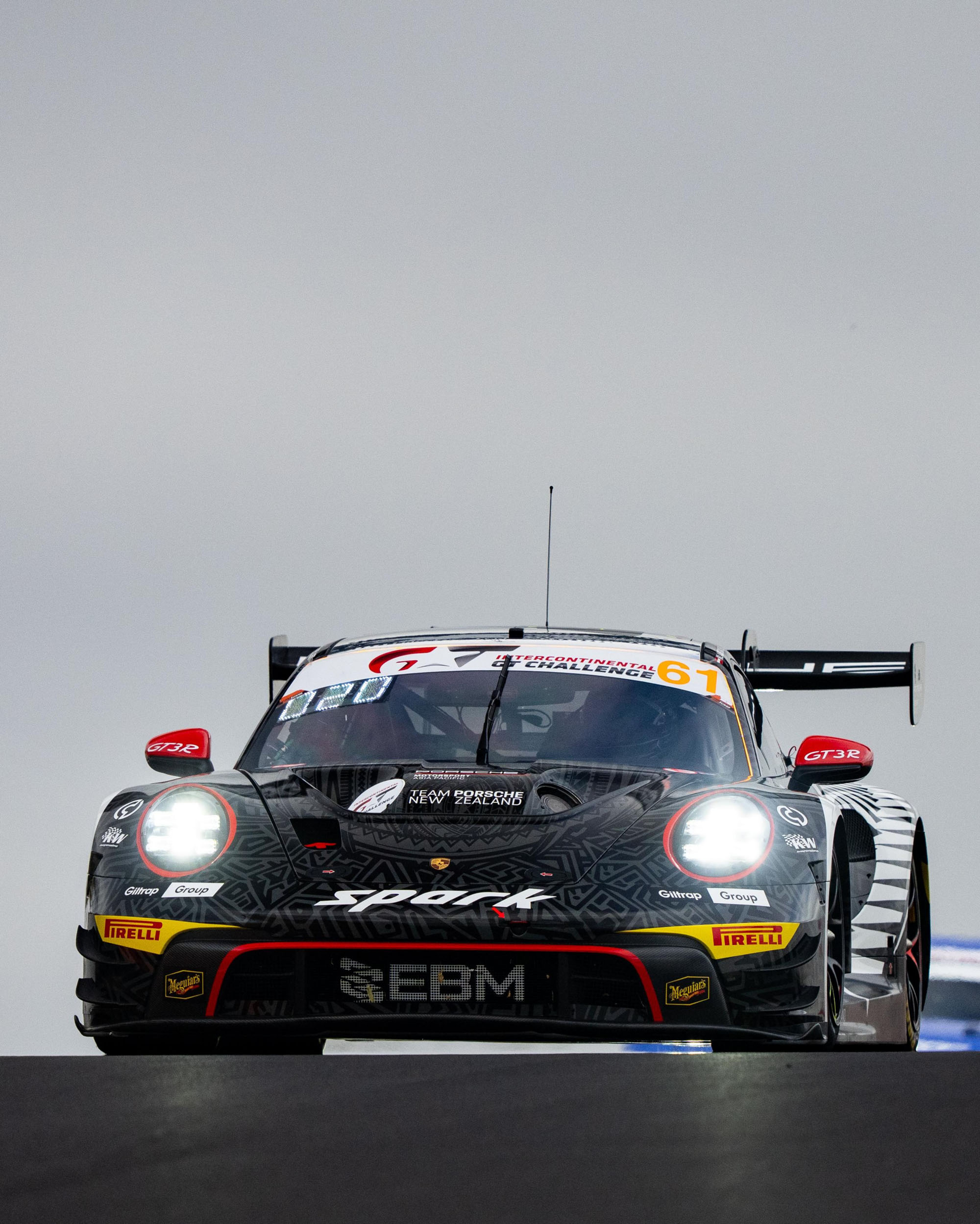A total of five 911 GT3 R lined up at the start of the endurance race at 5:45 a.m. on Sunday morning, including two all-professional crews: factory driver Matt Campbell, Belgian Alessio Picariello, and former Porsche Junior Bastian Buus from Denmark competed for Absolute Racing. At Earl Bamber Motorsport, factory driver Laurin Heinrich from Germany, Austrian Klaus Bachler, and Ricardo Feller from Switzerland formed a team. This trio had to line up at the back of the grid because their fastest qualifying lap had been canceled due to an incorrectly adjusted rear wing.