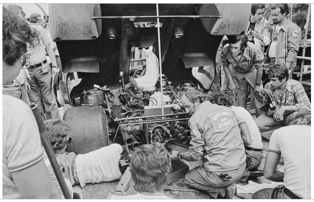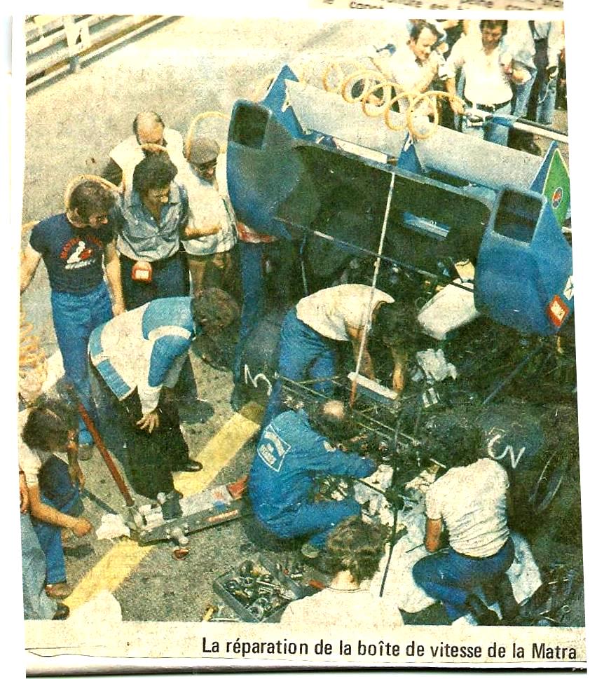 During the 1974 24 Hours of Le Mans, around 11:00 a.m., the #7 Matra MS670C (06), running in first place, suffered a gearbox failure. A 45-minute repair was required in the pits. According to a common story, Porsche mechanics assisted in the repairs in the Matra pits. However, no Porsche representatives are visible in the photographs provided. Therefore, a more plausible version is that a Porsche engineer was present in the Matra pits to file a complaint about a prohibited repair (ACO regulations prohibited gearbox casing replacement). Had the repairs taken longer or had the prohibited repairs been performed, Porsche would have secured victory.