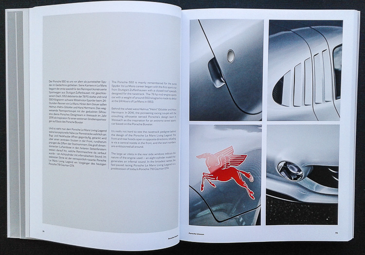 As the reader can imagine, this book is mostly about the visual offering, but each model presented is accompanied by text explaining the origins and the inspiration for that model. The layout of the book is clean and impressive, as you might expect from a book about vehicle design. It is a large book comprising 328 pages, but it is unquestionably an impressive piece of work allowing the reader a look behind the curtain at what Porsche designers get up to.