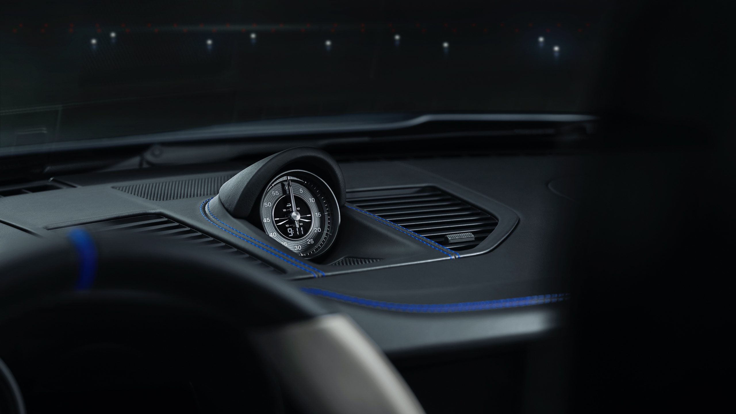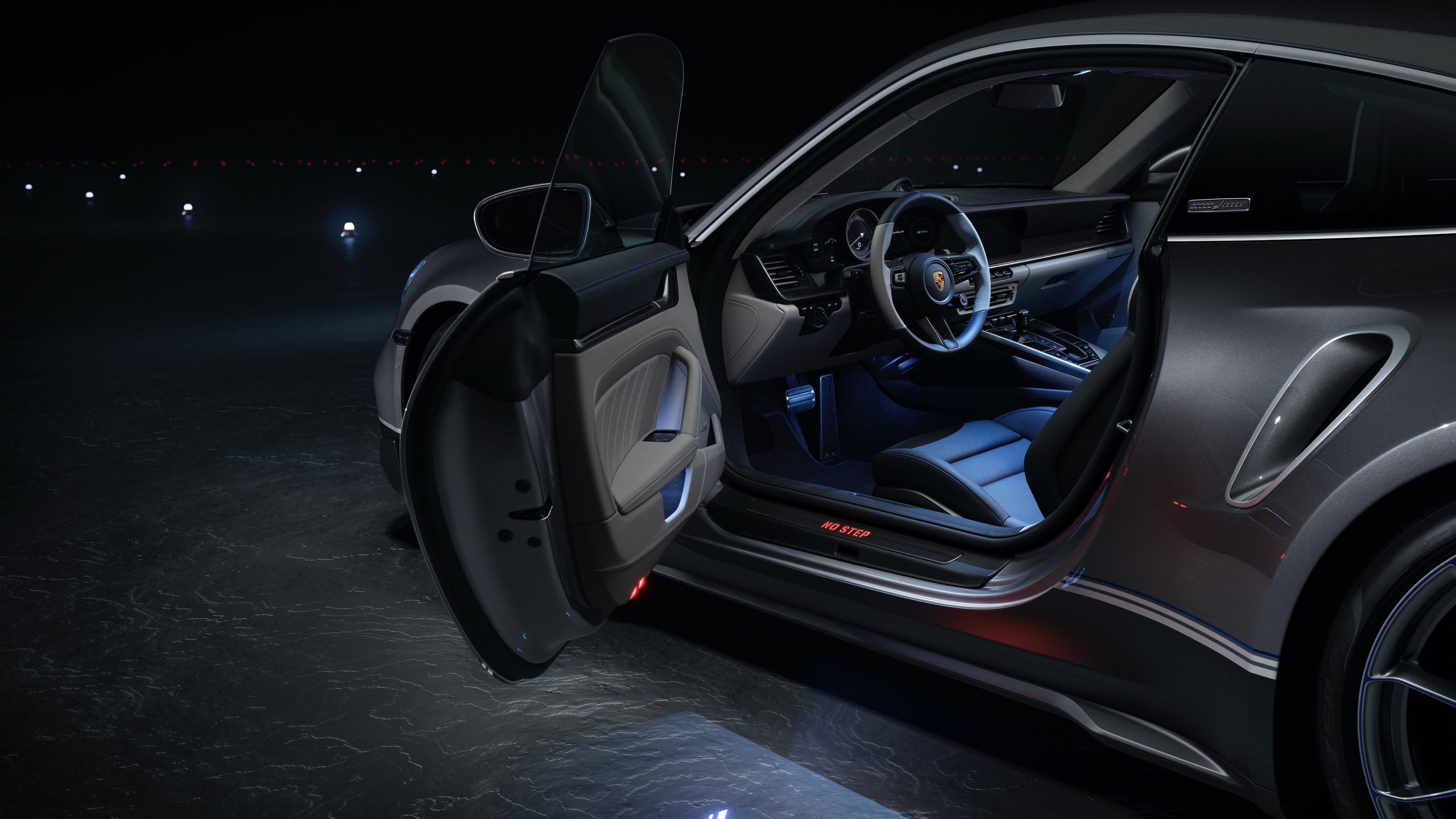 The Duet logo is used on the exterior and in the interior of both products: it is embossed on the head restraints, for example, and also features on the limited-edition badge. Other design details on this very special 911 Turbo S establish a link to aviation: the individual registration of the respective jet can be found on the underside of the rear wing and on the sides of the vehicle key. The door sill trims feature “No step” lettering illuminated in red. The dial on the stopwatch from the Sport Chrono package has a printed-on artificial horizon.