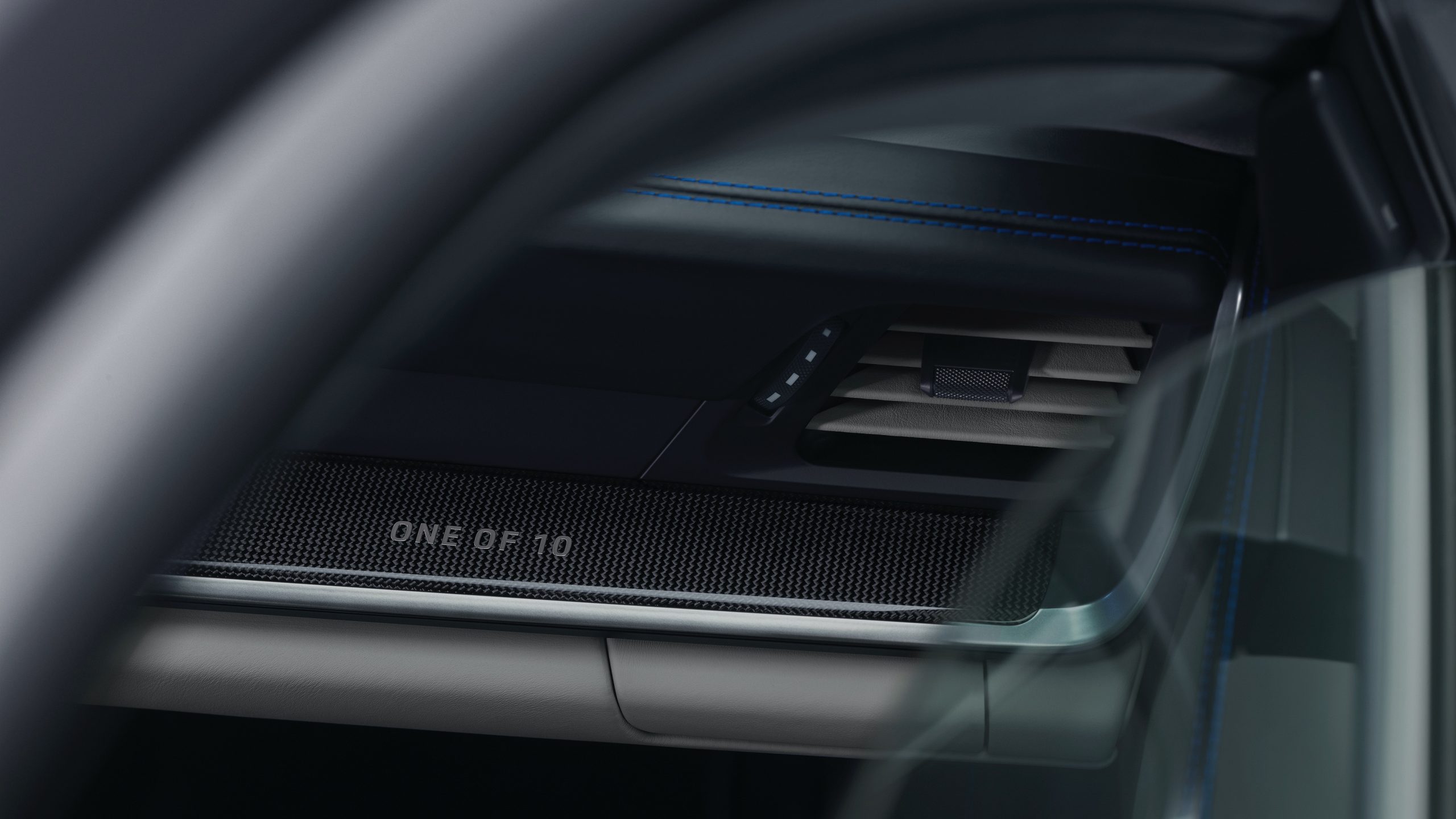 The door sill trims feature “No step” lettering illuminated in red – a reference to the corresponding signs on aircraft wings. The stopwatch of the Sport Chrono package also borrows from aviation: in addition to the cooperation logo, the dial also has a printed-on artificial horizon. In the cockpit of the jet, a similar gyroscope provides information about the flight attitude, that is to say movements about the longitudinal and lateral axes, particularly during instrument flights. On the front passenger side, the dash panel trim features a “One of 10” logo. The front luggage compartment is hand-finished in black leather, with contrast stitching in Speed Blue. The sides of the vehicle key are painted in Speed Blue and are marked with the jet registration. The logo is embossed in the leather of the key pouch. An indoor car cover with “Remove before flight” tags is also included.
