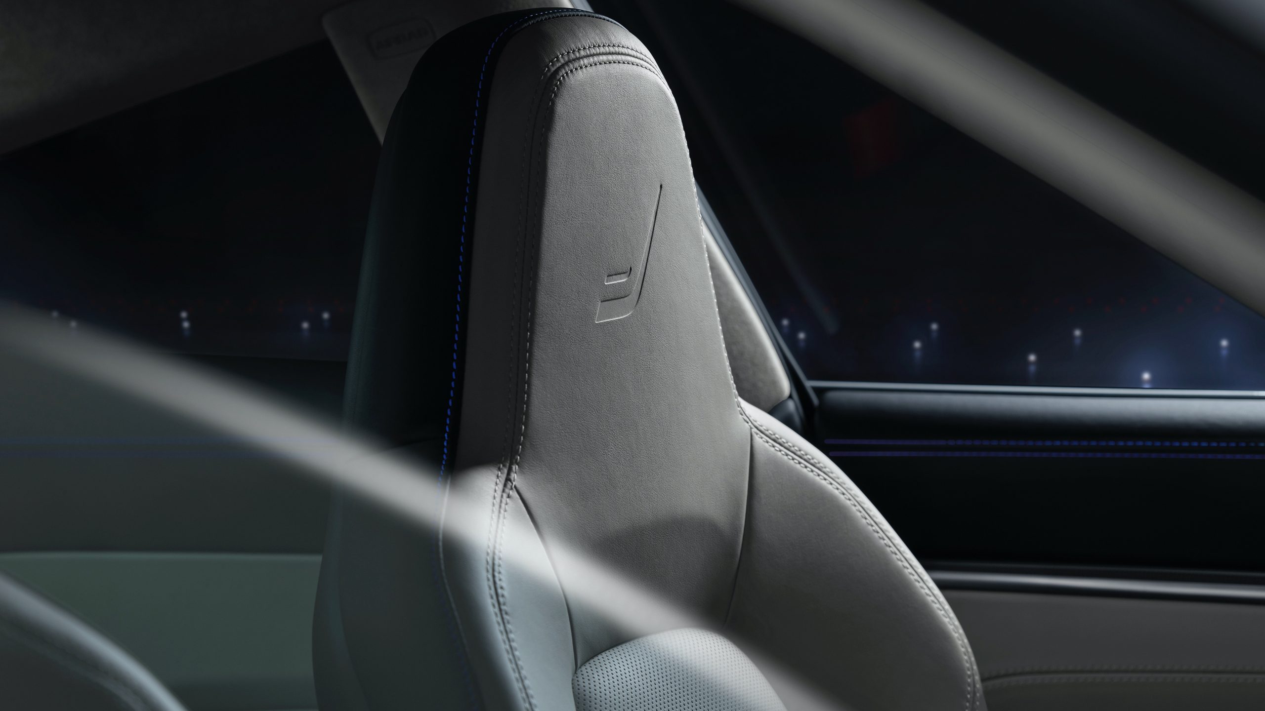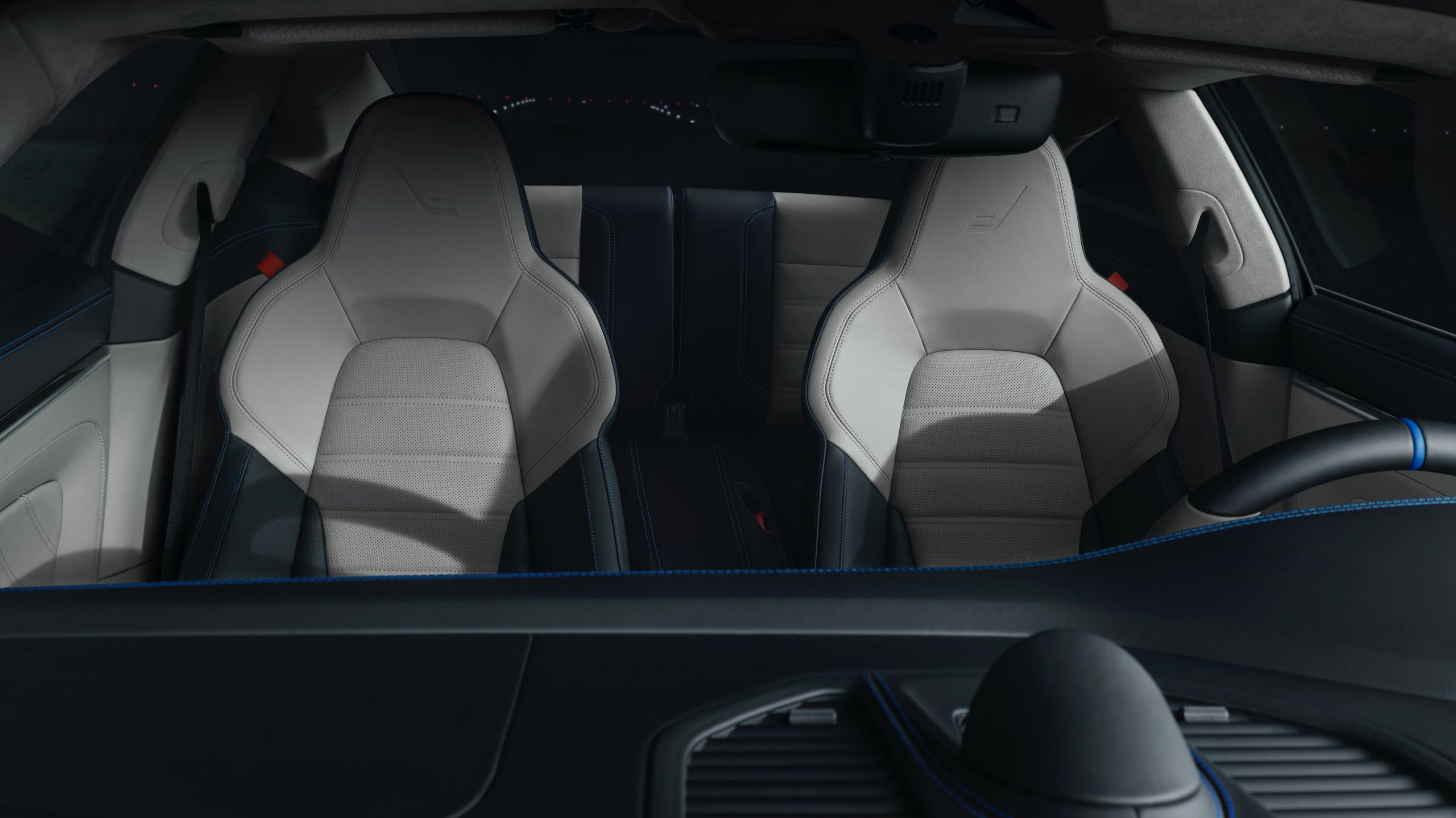 For the Coupé produced as part of the cooperation with Embraer, Porsche has combined gloss and satin-gloss paintwork for the first time: the upper part of the sports car is finished in Platinum Silver Metallic, while the bottom part is in Jet Grey Metallic. A trim strip with lines in Brilliant Chrome and Speed Blue runs over the sides and doors. All the paintwork is completed by hand, like the painting process for the jet.