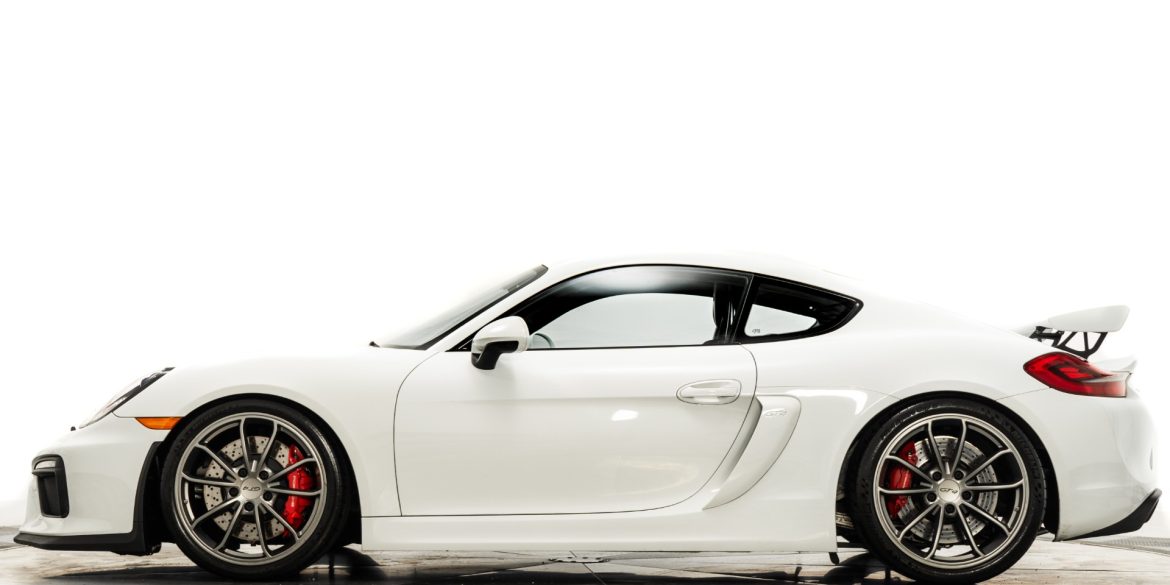 2016 Porsche Cayman GT4 in White over Black interior with only 12,718 miles. This Cayman is loaded with: 3.8 Liter H6 with 385 horsepower, 6 speed manual transmission, 20 inch wheels in satin charcoal, wing supports in black, bixenon headlamps with dynamic lighting, leather interior in Black with Guards Red...
