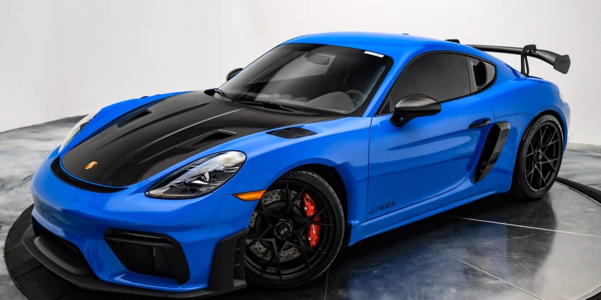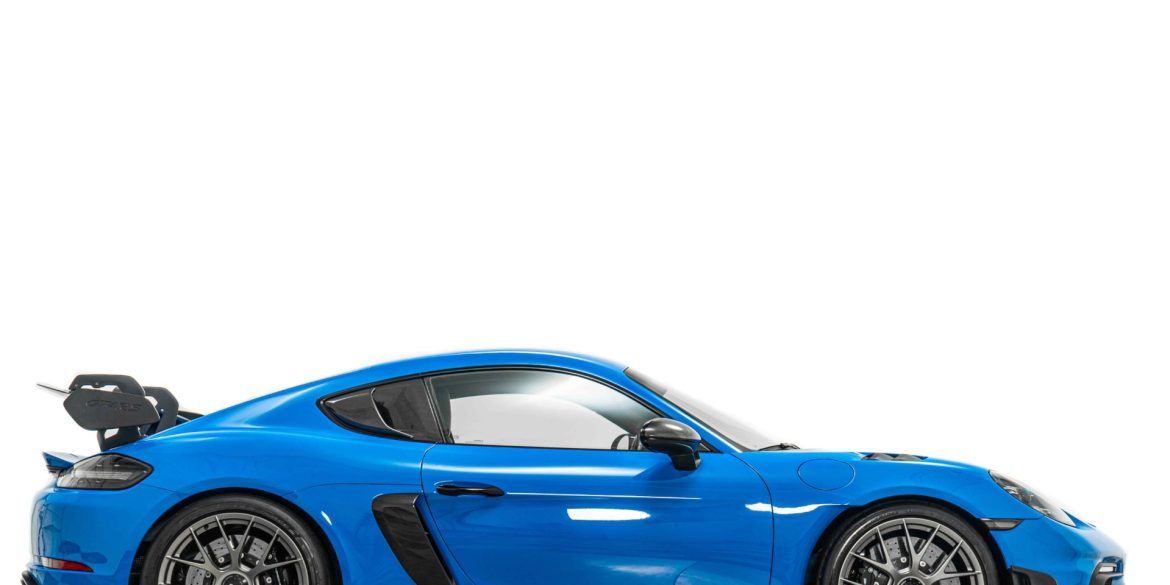 2023 Porsche Cayman GT4 RS in Shark Blue over Black with only 3,048 miles. This GT4 is loaded with: 4.0 Liter H6 with 493 horsepower, 7 speed PDK transmission, satin 20 inch forged magnesium GT4 RS wheels, Weissach package (logo on top of rear windshield in dark silver, titanium tailpipes,...
