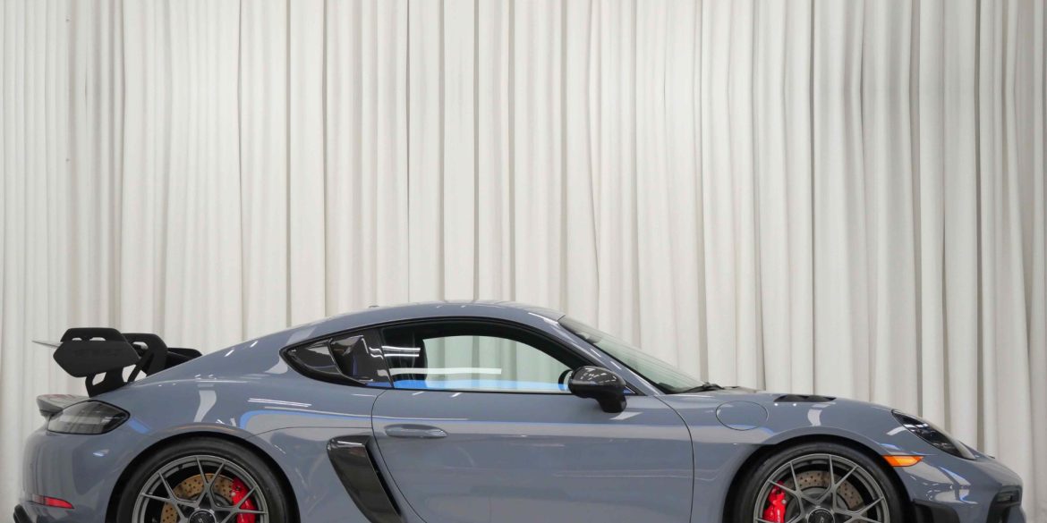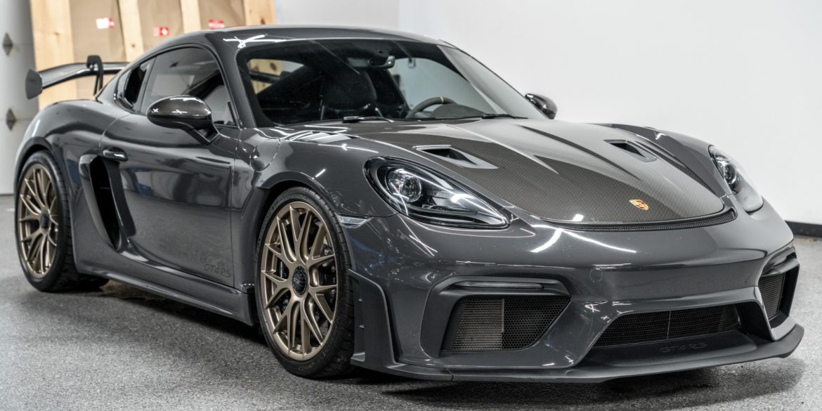 2023 Porsche Cayman GT4 RS in paint to sample Gray Black over Black with only 6,868 miles. This GT4 is loaded with: 4.0 Liter H6 with 493 horsepower, 7 speed PDK transmission, 20 inch forged magnesium GT4 RS wheels in satin neodyme, Weissach package (logo on top of rear windshield...