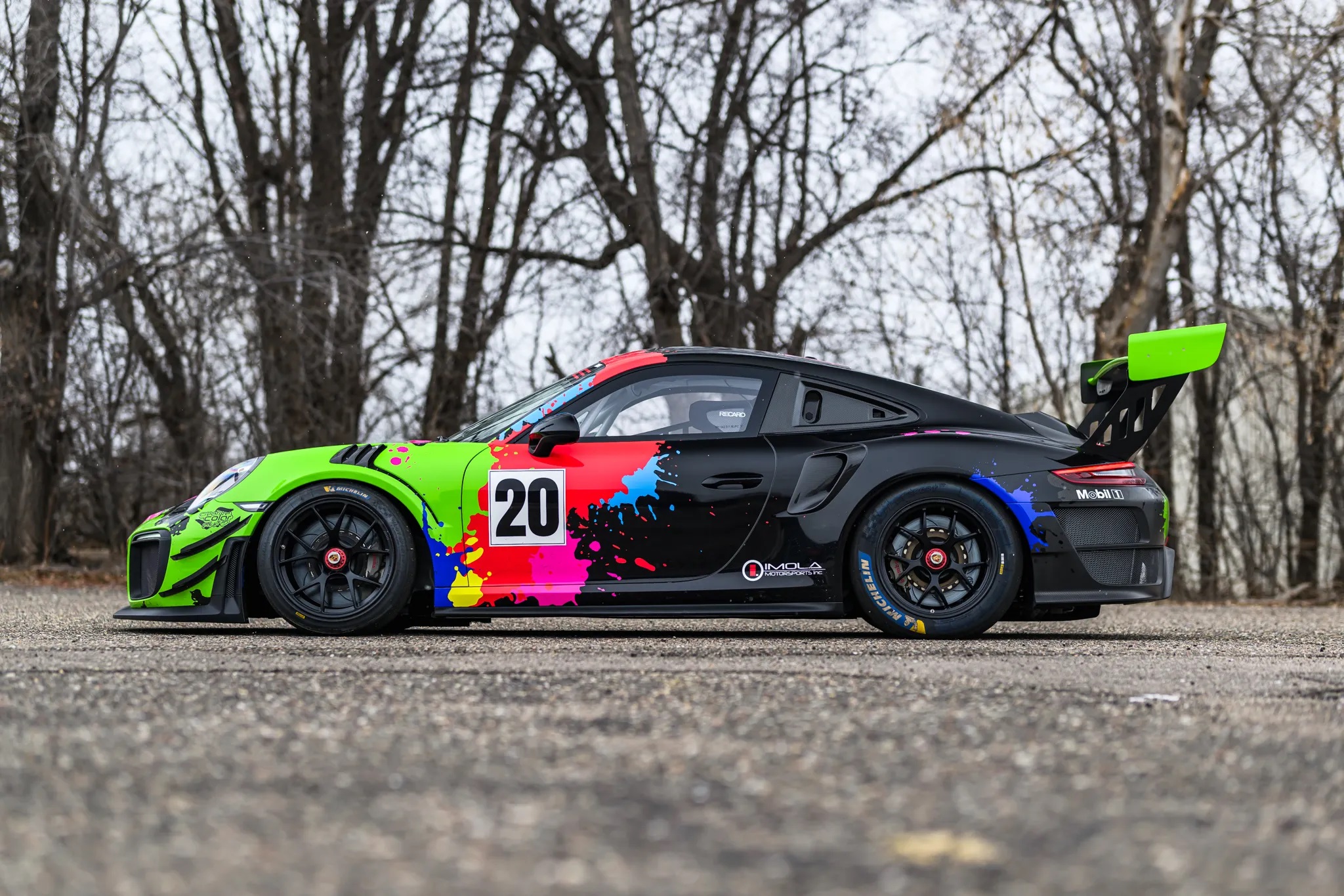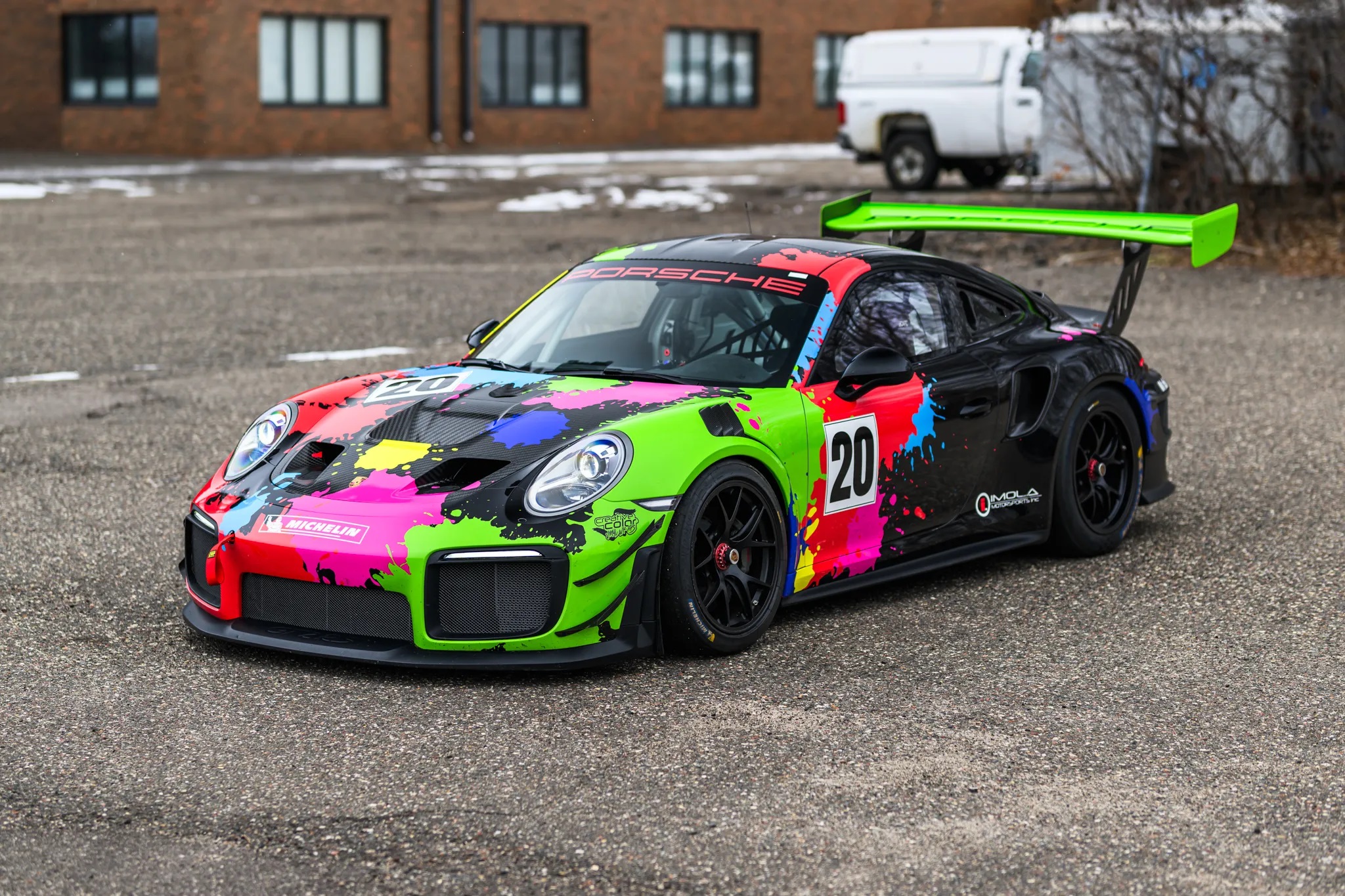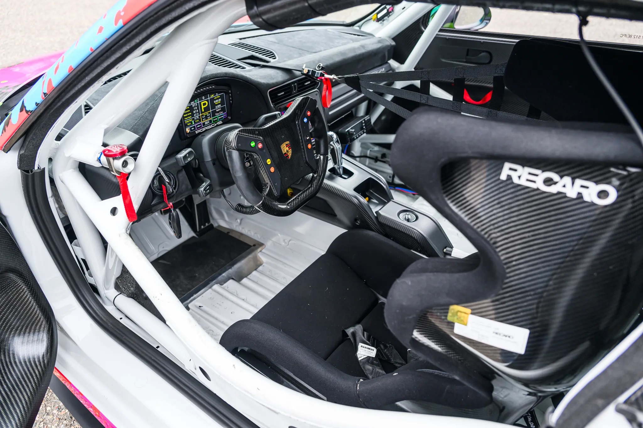 The car’s power comes from a twin-turbo 3.8L flat-six engine paired with a seven-speed PDK dual-clutch automatic and a limited-slip differential. Its body panels are finished in white with a custom vinyl livery, while the interior features a black cloth Recaro race seat with a Schroth Racing six-point harness.