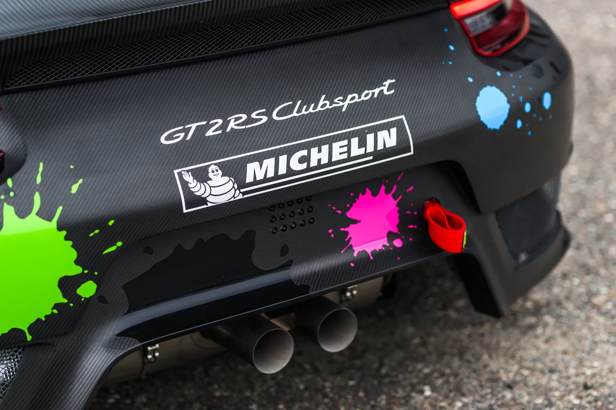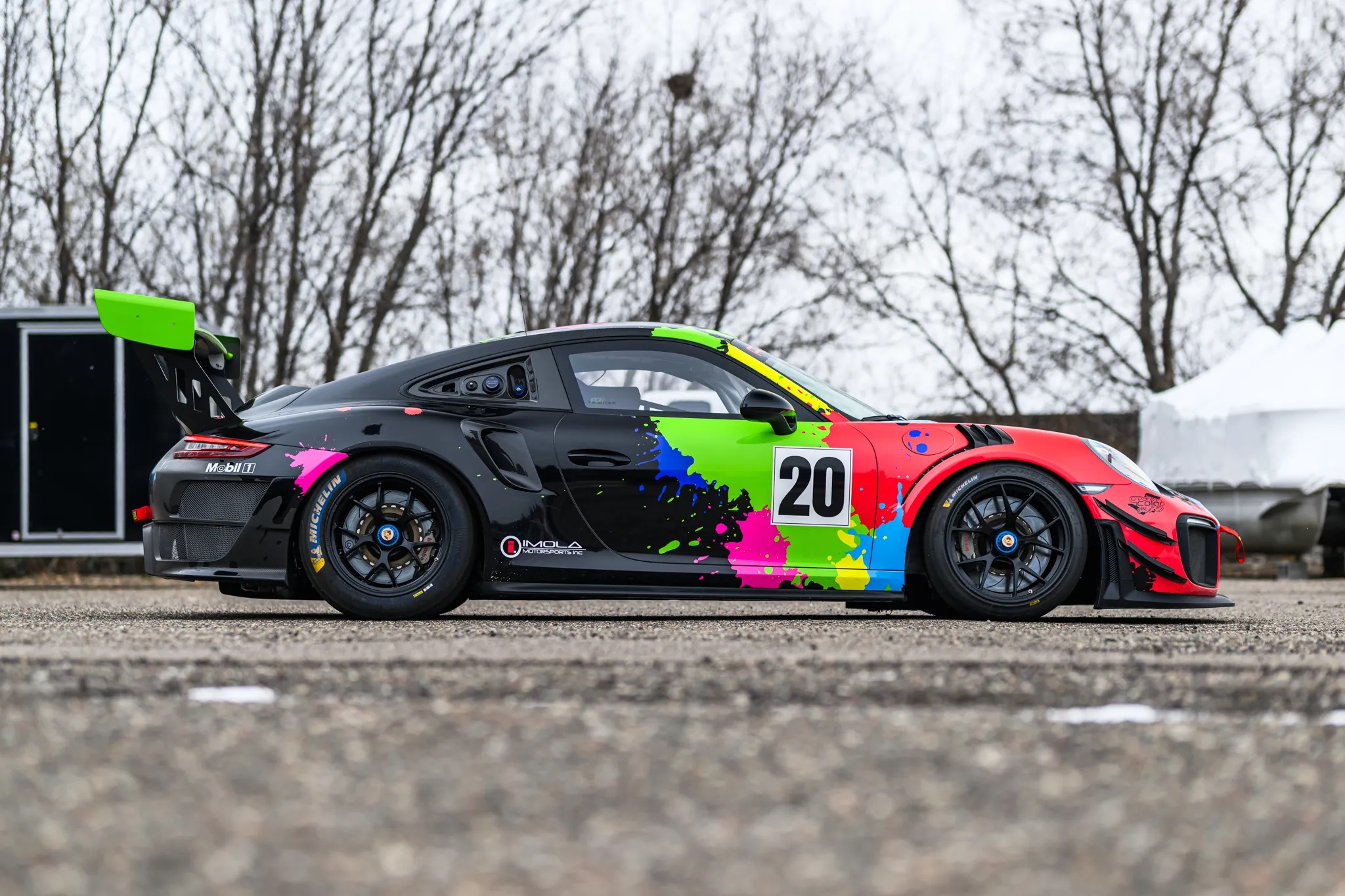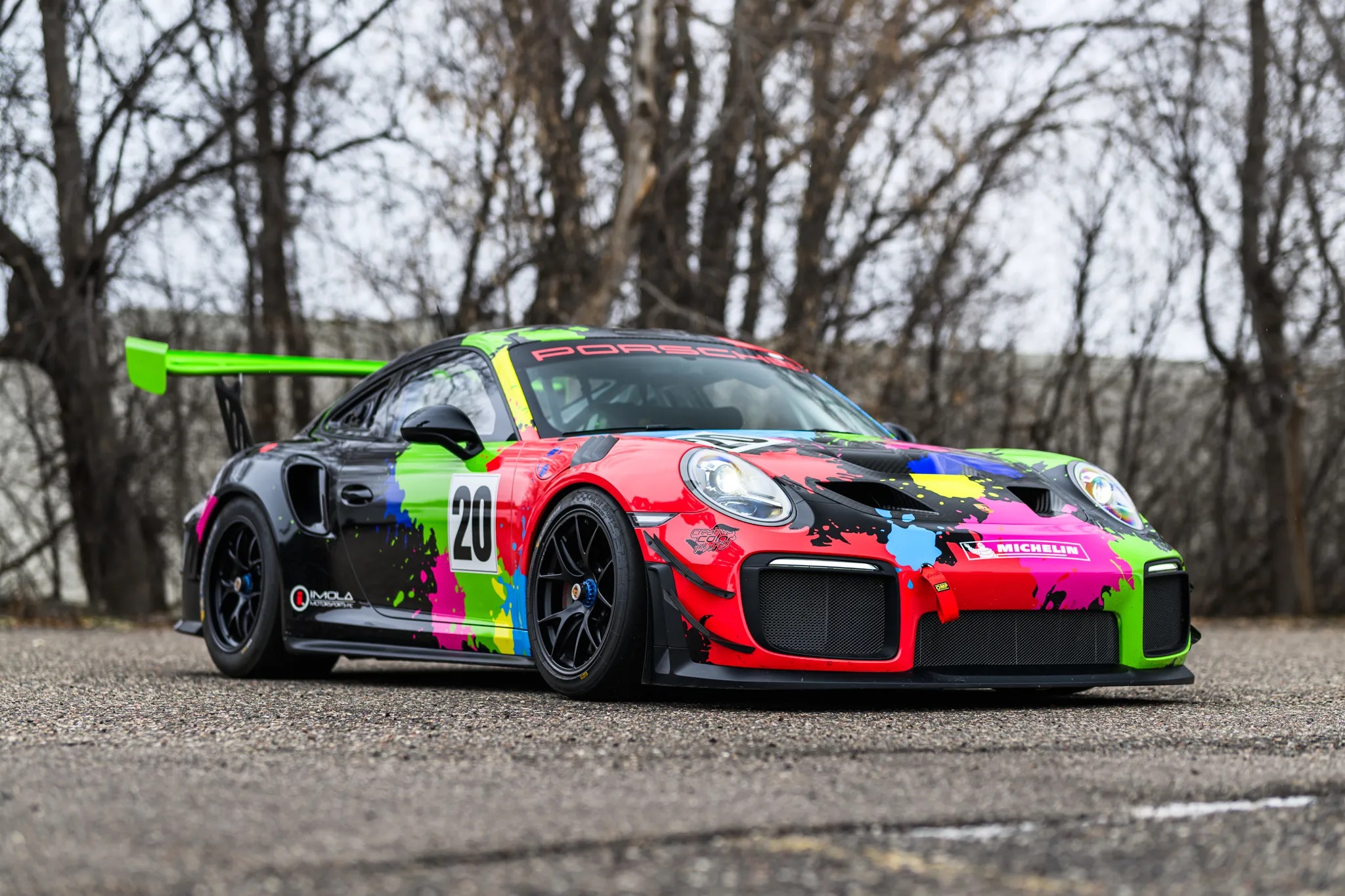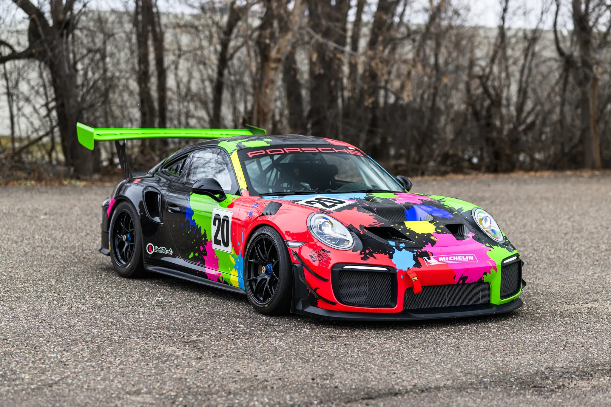 The car’s power comes from a twin-turbo 3.8L flat-six engine paired with a seven-speed PDK dual-clutch automatic and a limited-slip differential. Its body panels are finished in white with a custom vinyl livery, while the interior features a black cloth Recaro race seat with a Schroth Racing six-point harness.