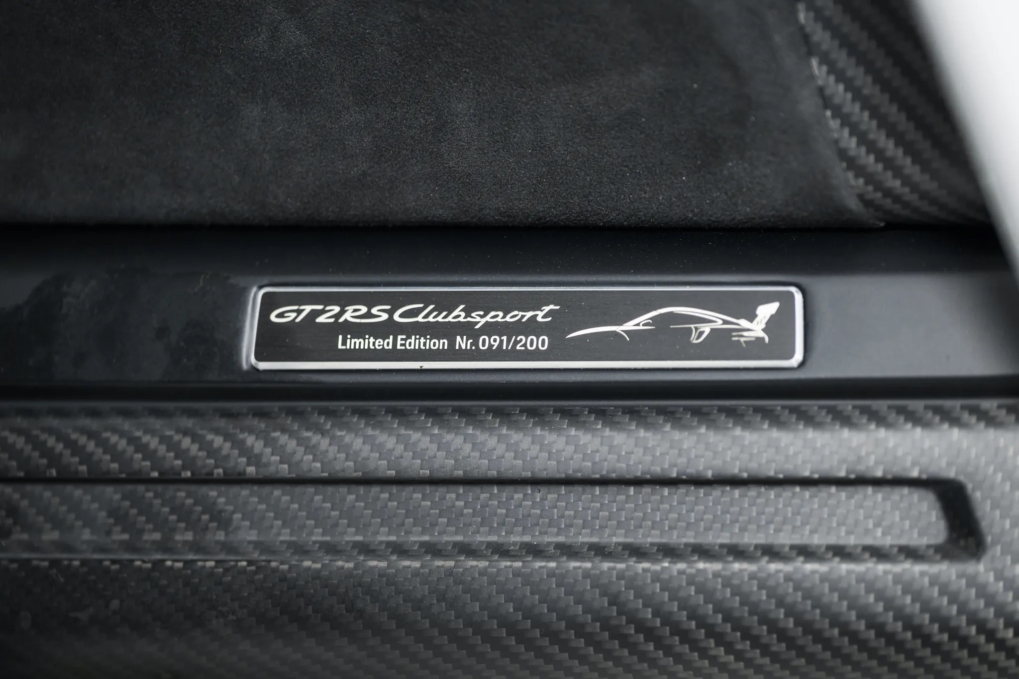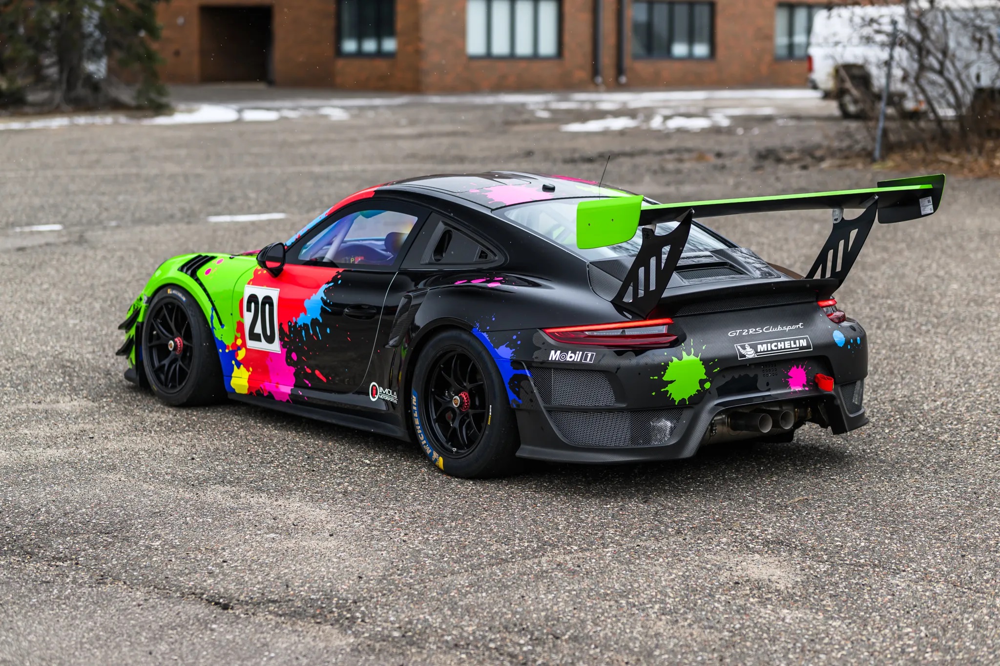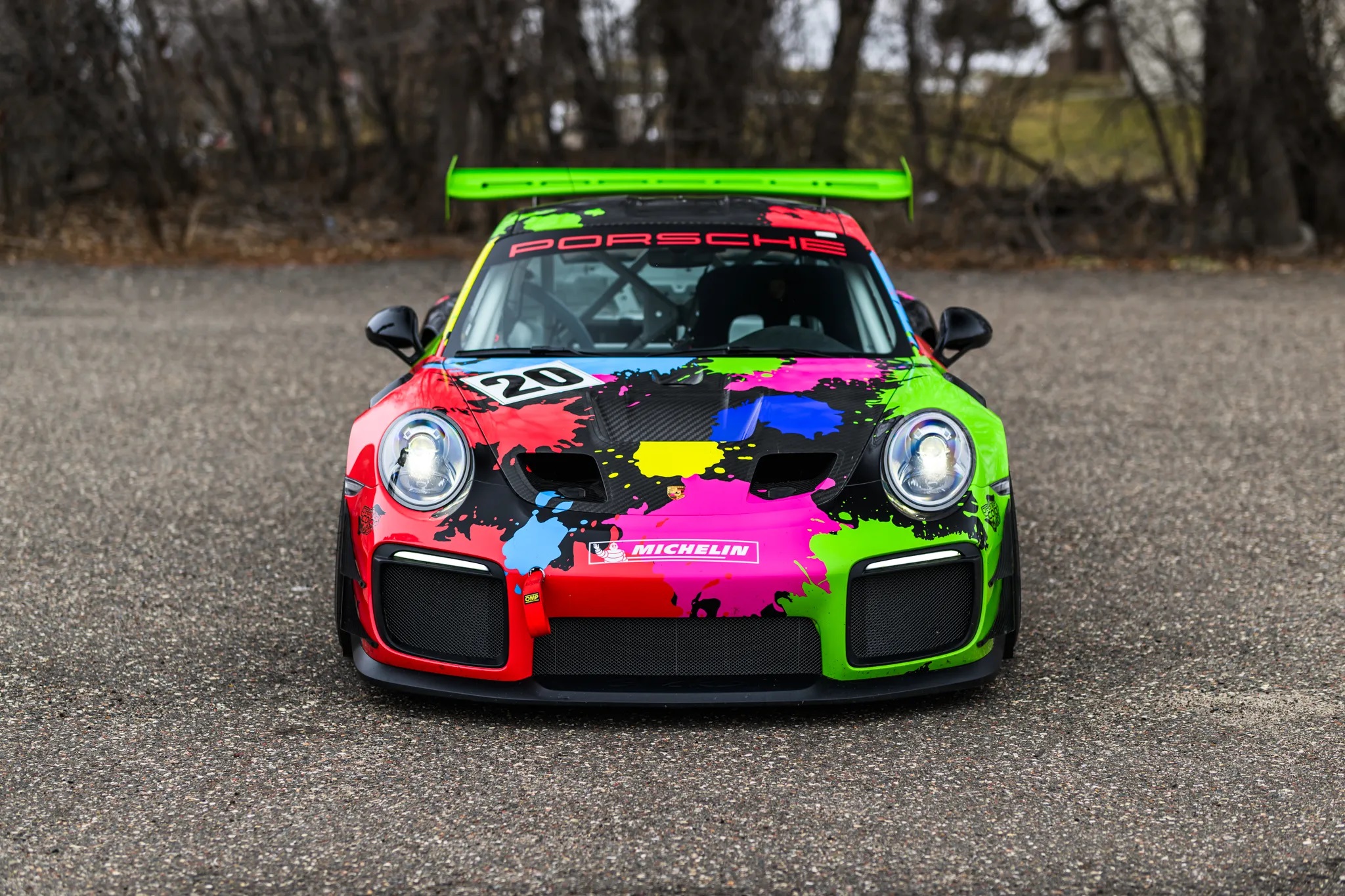 The 2019 Porsche 911 GT2 RS shown here is #91 of 200 track-only Clubsport models for that year, designed to meet FIA regulations. It features 18” BBS forged wheels, carbon-fiber front dive planes, bi-xenon headlights, an adjustable rear wing, and a roll cage.