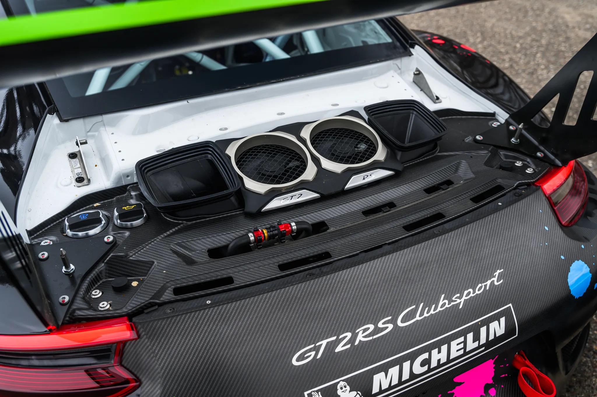 The GT2 RS incorporates a magnesium roof, carbon-fiber front and rear wings, and a carbon-fiber bonnet and boot lid. The use of lightweight polyurethane for the front and rear aprons, polycarbonate for the rear and side windows, and a titanium exhaust system contribute to a claimed wet weight of 3,241 lbs.