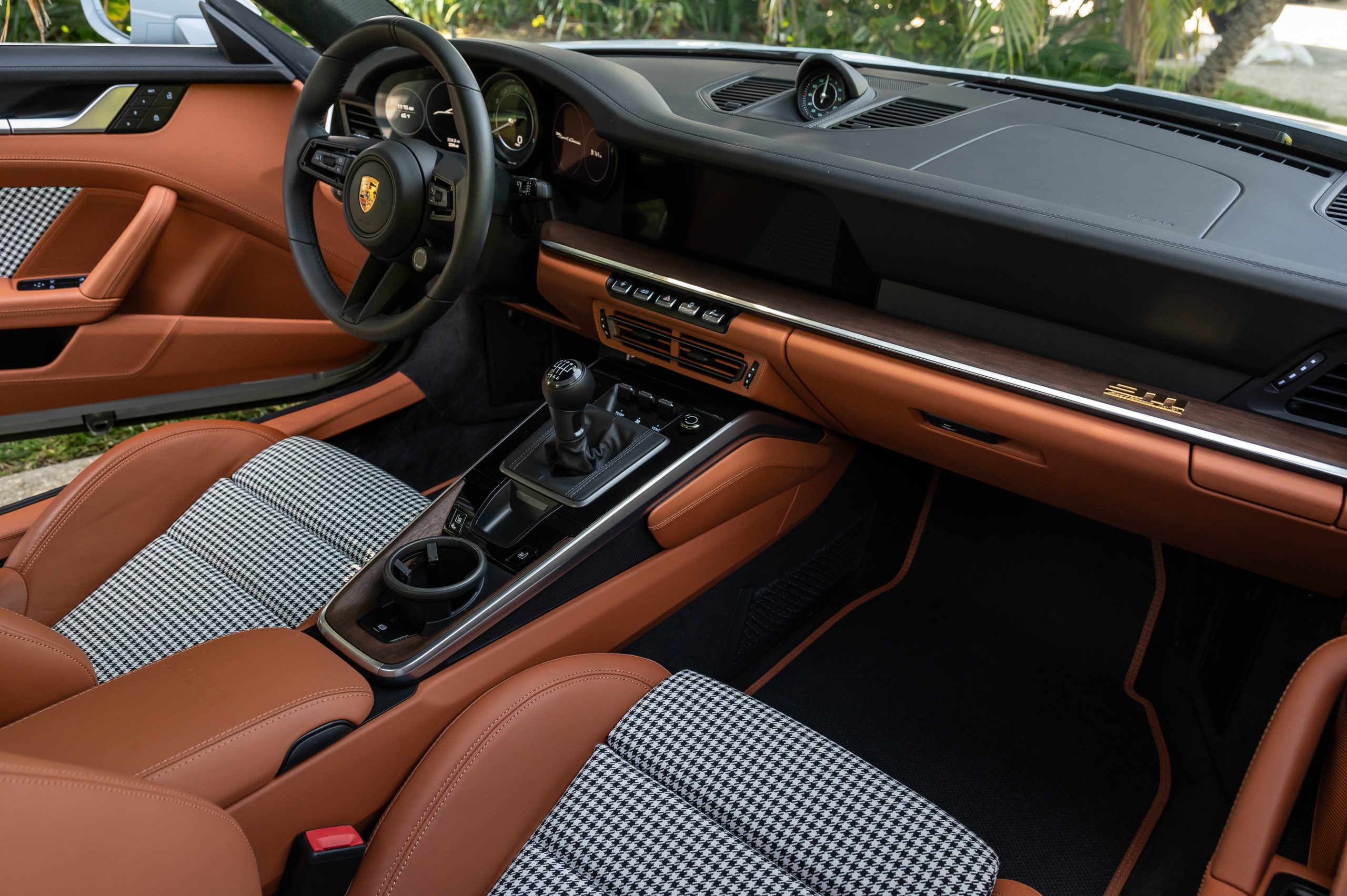 This specific Sport Classic is in pristine condition, having been driven a mere 350 miles since new by its current owner. It features the launch edition’s Sport Grey Metallic exterior and a stunning “Heritage Design” interior in black and classic cognac leather, complete with charming pepita inserts in the seats and door panels.