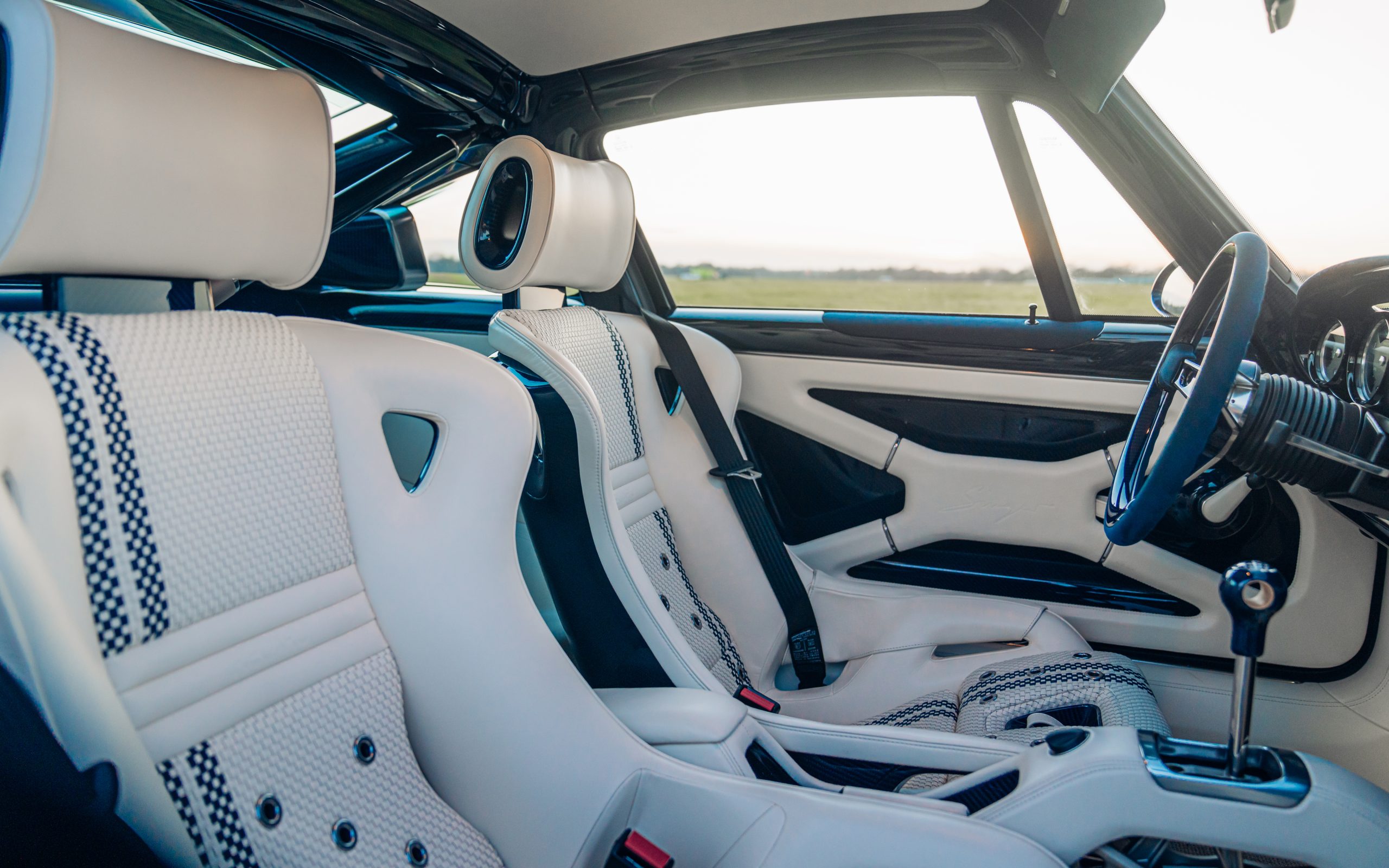 Polished titanium brightwork, magnesium wheels, and discreetly smoked taillights (a rare $18,000 option) further elevate its aesthetic. Inside, a luxurious combination of cream leather, navy blue Alcantara, and matching carbon fiber trim defines the cabin. The custom bucket seats feature a distinctive weave pattern with double offset navy stripes, enhancing the tailored look.Despite being built to left-hand drive specifications, this car was intended for the UK market and can be easily adapted for various regions.
