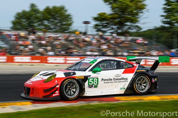 IMSA Road America, 5 August 2018: The #58 Wright Motorsports Porsche 911 GT3 R driven by Patrick Long and Christina Nielsen