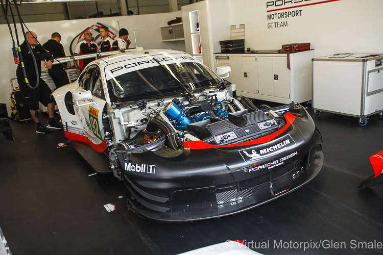 WEC Silverstone 6 Hours, 18-19 August 2018: #91 Porsche 911 RSR driven by Richard Lietz/Gianmaria Bruni, and #92 Porsche 911 RSR driven by Michael Christensen/Kevin Estre, in the pit lane before Free Practice 2