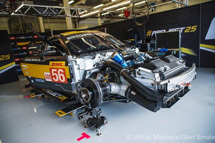 WEC Silverstone 6 Hours, 18-19 August 2018: The #56 Team Project 1 Porsche 911 RSR (LMGTE Am class) driven by Jörg Bergmeister, Patrick Lindsey and Egidio Perfetti being prepared in the pit garage on 16 August 2018