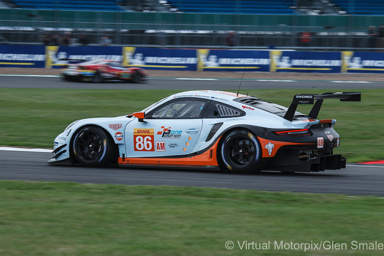 WEC Silverstone 6 Hours, 18-19 August 2018: The #86 Gulf Racing Porsche 911 RSR (LMGTE Am class) driven by Michael Wainwright/Ben Barker/Alex Davison during FP2 on Friday 17 August 2018