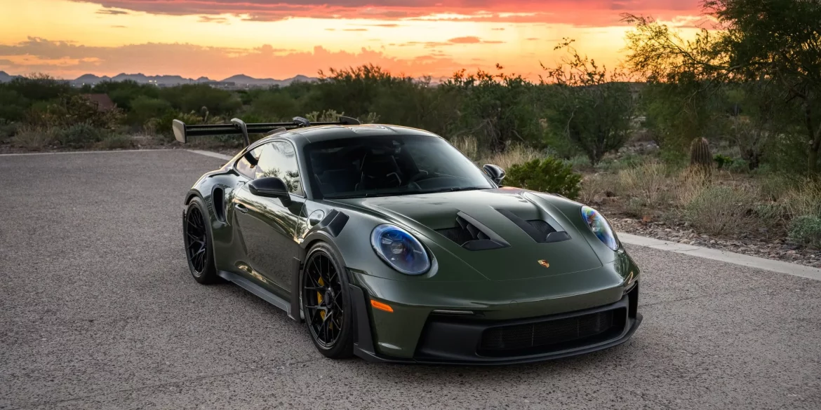 This 2024 Porsche 911 GT3 RS is finished in paint-to-sample Nato Olive over black leather and Race-Tex upholstery, and is powered by a 4.0-liter flat-six that drives the rear wheels through a seven-speed PDK dual-clutch automatic transaxle. It was specified with Porsche Ceramic Composite Brakes, LED-Matrix Design headlights with PDLS+,...