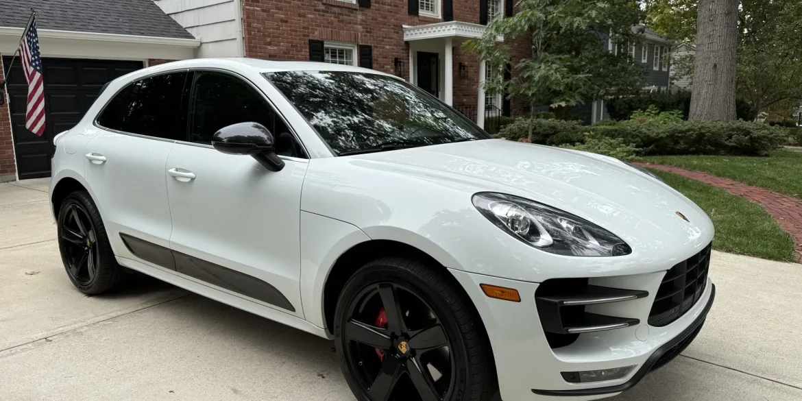 This 2016 Porsche Macan Turbo is powered by a twin-turbocharged 3.6-liter V6 that sends power to all four wheels through a seven-speed PDK dual-clutch automatic transaxle. It is finished in white over black leather and has a panoramic roof, xenon headlights, parking sensors, and a carbon-fiber rear spoiler, mirror caps,...
