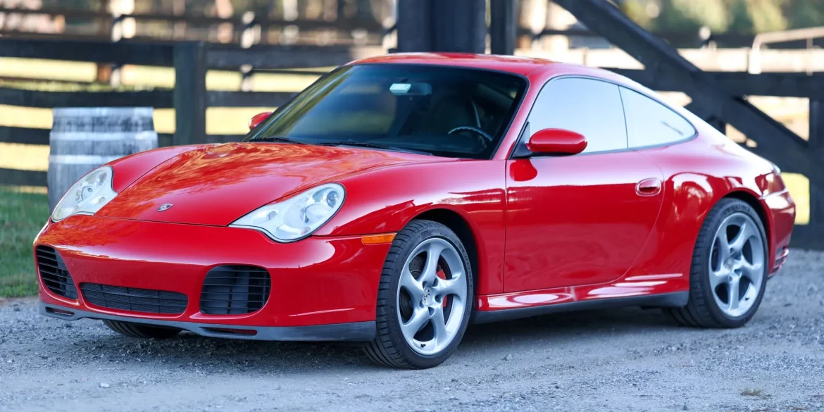 This 2003 Porsche 911 Carrera 4S coupe is powered by a 3.6-liter flat-six that drives all four wheels through a six-speed manual transaxle and is finished in Guards Red over black leather. Equipment includes a speed-activated rear spoiler, a sunroof, xenon headlights, fog lights, 18″ Turbo-look wheels, Bilstein B6 front...
