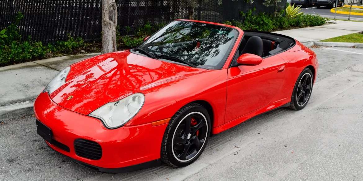 This 2004 Porsche 911 Carrera 4S cabriolet is finished in Guards Red over a black leather interior, and was specified with Guards Red seatbelts and painted interior trim pieces. The car has 82k miles and is powered by a 3.6-liter flat-six that drives all four wheels through a six-speed manual...
