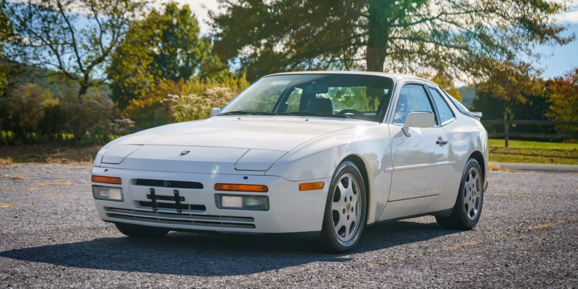 This 1989 Porsche 944 Turbo is powered by a turbocharged 2.5-liter inline-four paired with a five-speed manual transaxle and is finished in Alpine White over Marine Blue leather upholstery. Showing 61k miles, the car is equipped with 16″ Club Sport alloy wheels, a limited-slip differential, pop-up headlights, fog lights, power-adjustable front...