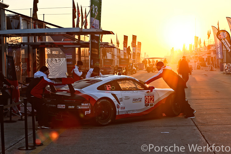 Following qualifying, the #912 Porsche started from sixth place with the #911 car in eighth place. After the first lap, the #912 car had moved up two places in class while their teammates had gained three places. The first of eleven safety car phases came after just 14 laps, but on lap 40, Laurens Vanthoor moved into the lead for the first time, a position which his teammate, Gianmaria Bruni, held at the front of the GT field for some time.