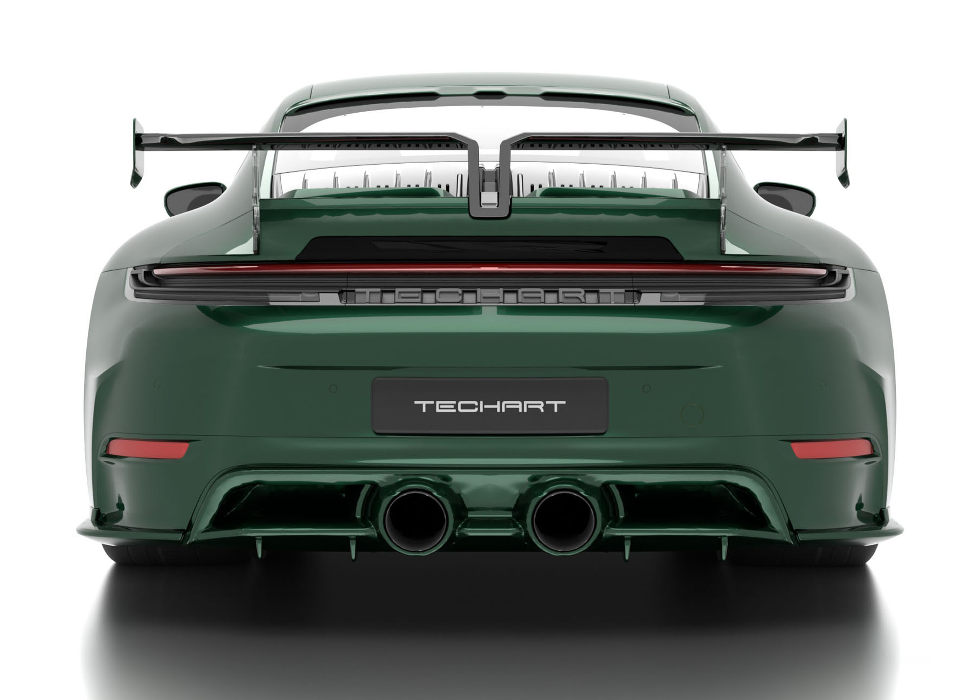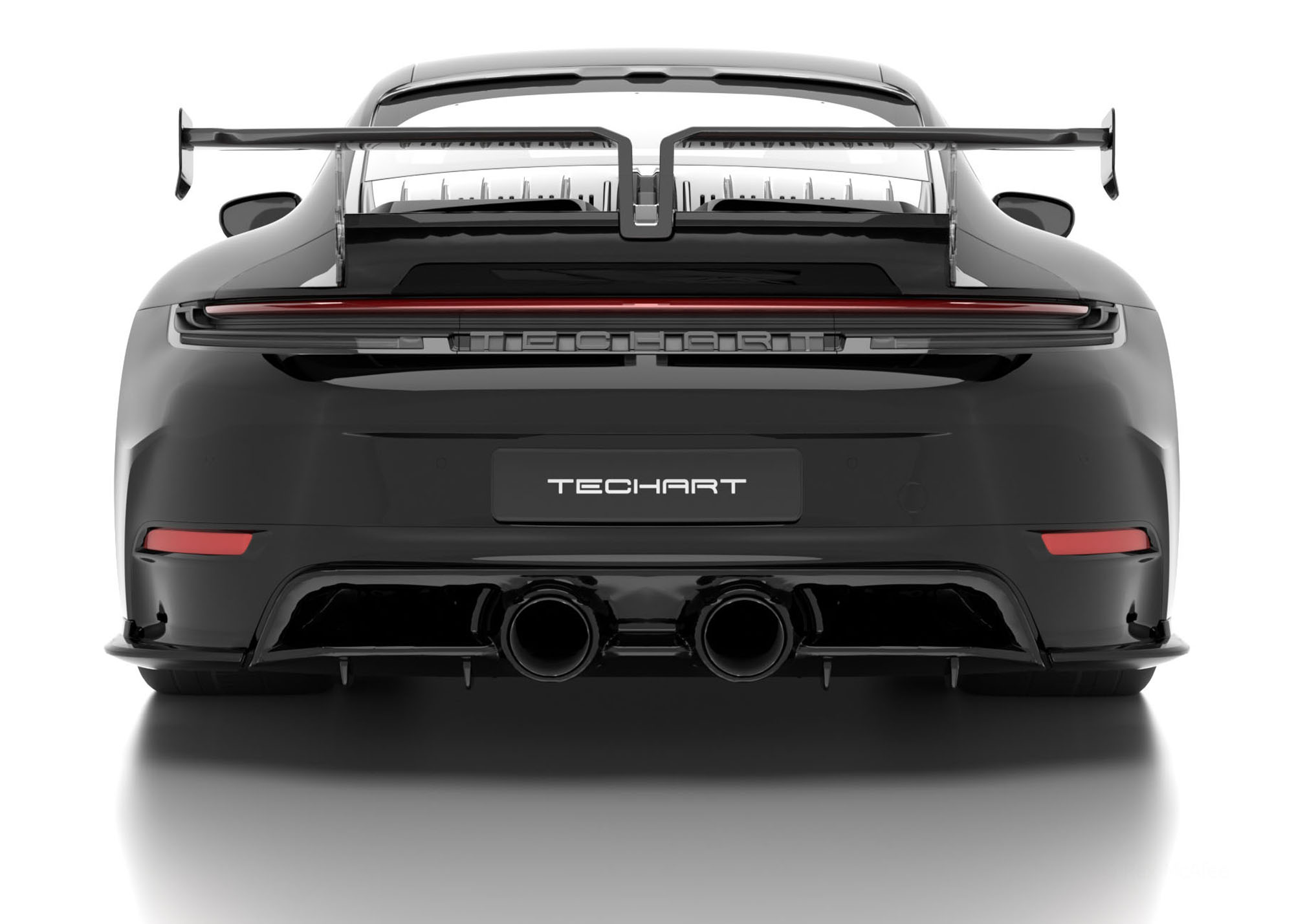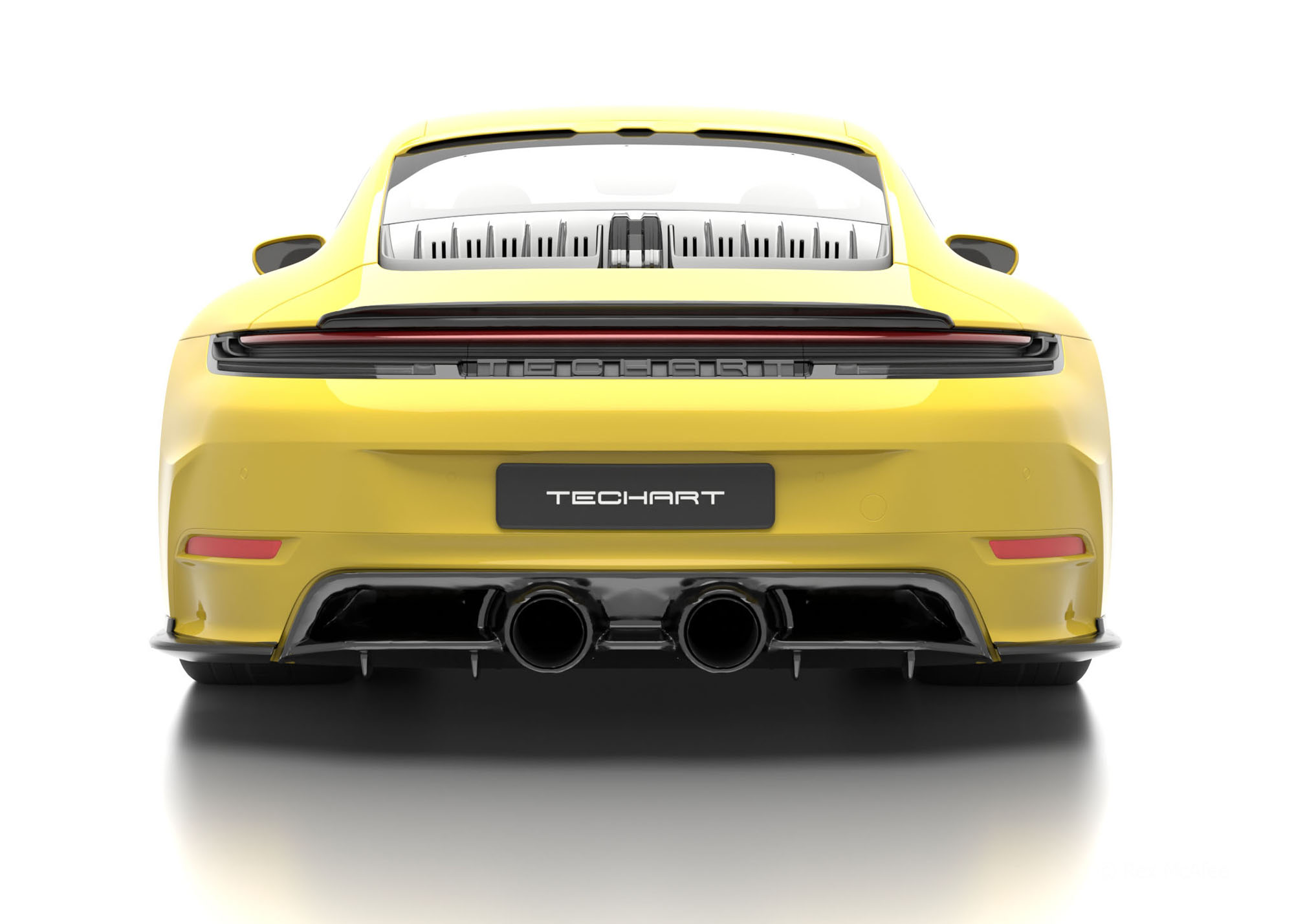 - At the rear, a multi-part TECHART diffuser defines the lower vehicle architecture. Stainless steel tailpipe trims with a laser-engraved TECHART logo, integrated heat protection and four air-guide fins form a precisely coordinated unit.