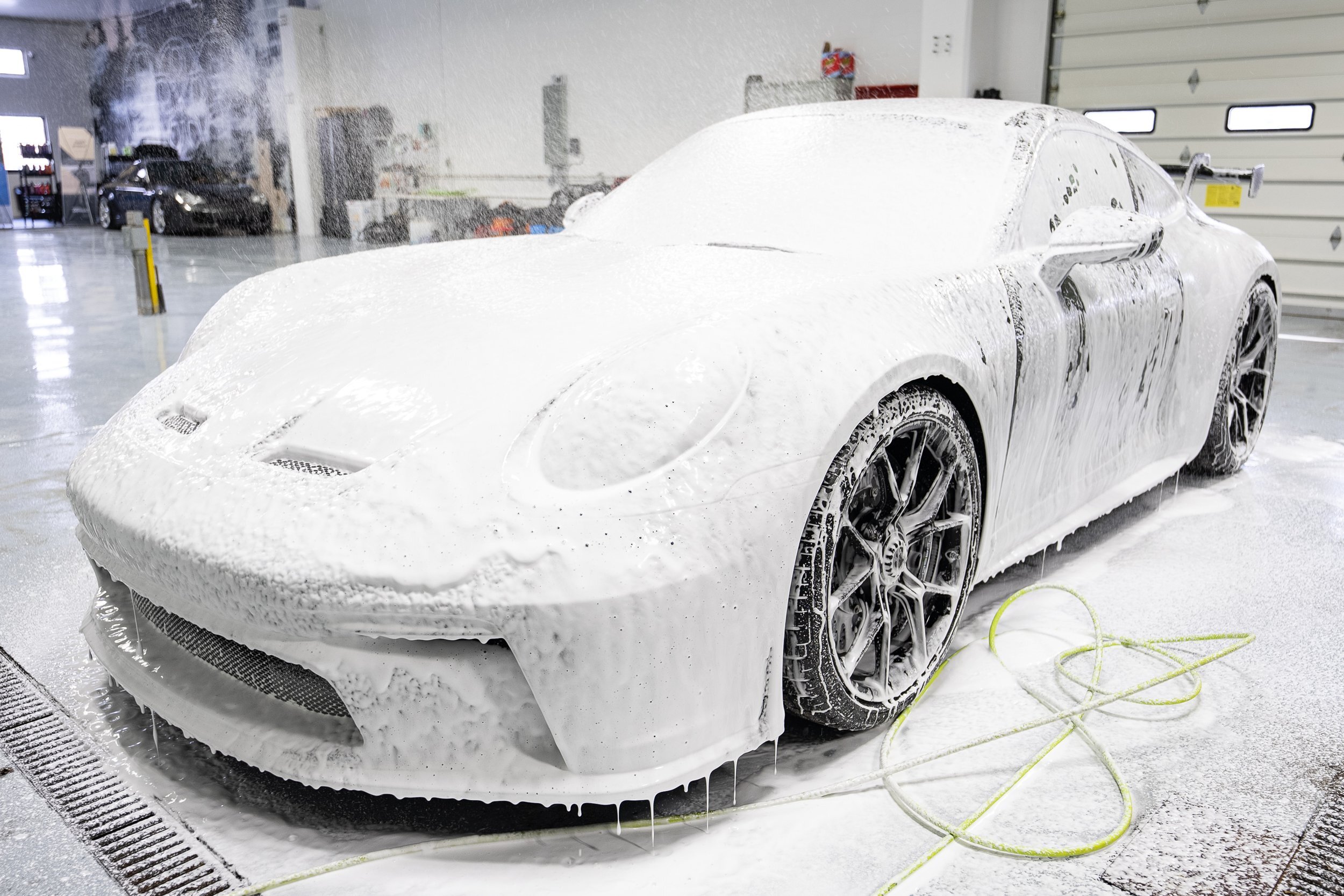 Before the mitt touches the bodywork, you want to loosen and lift as much dirt as possible. That’s where foam earns its reputation. Covering your Porsche in snow foam isn’t just a spectacle, it’s science. The foam clings to grime, softens it, and allows it to rinse away safely.