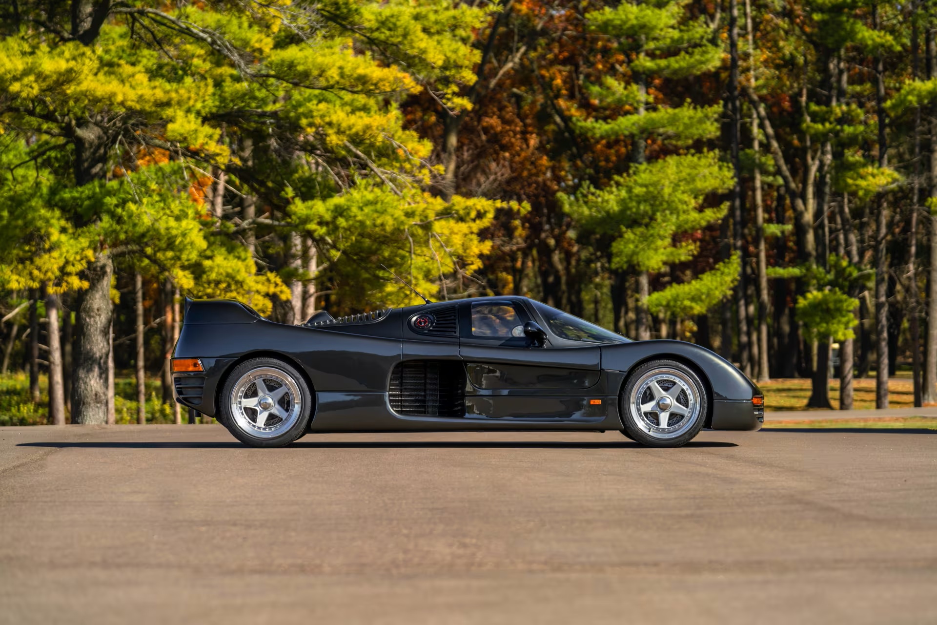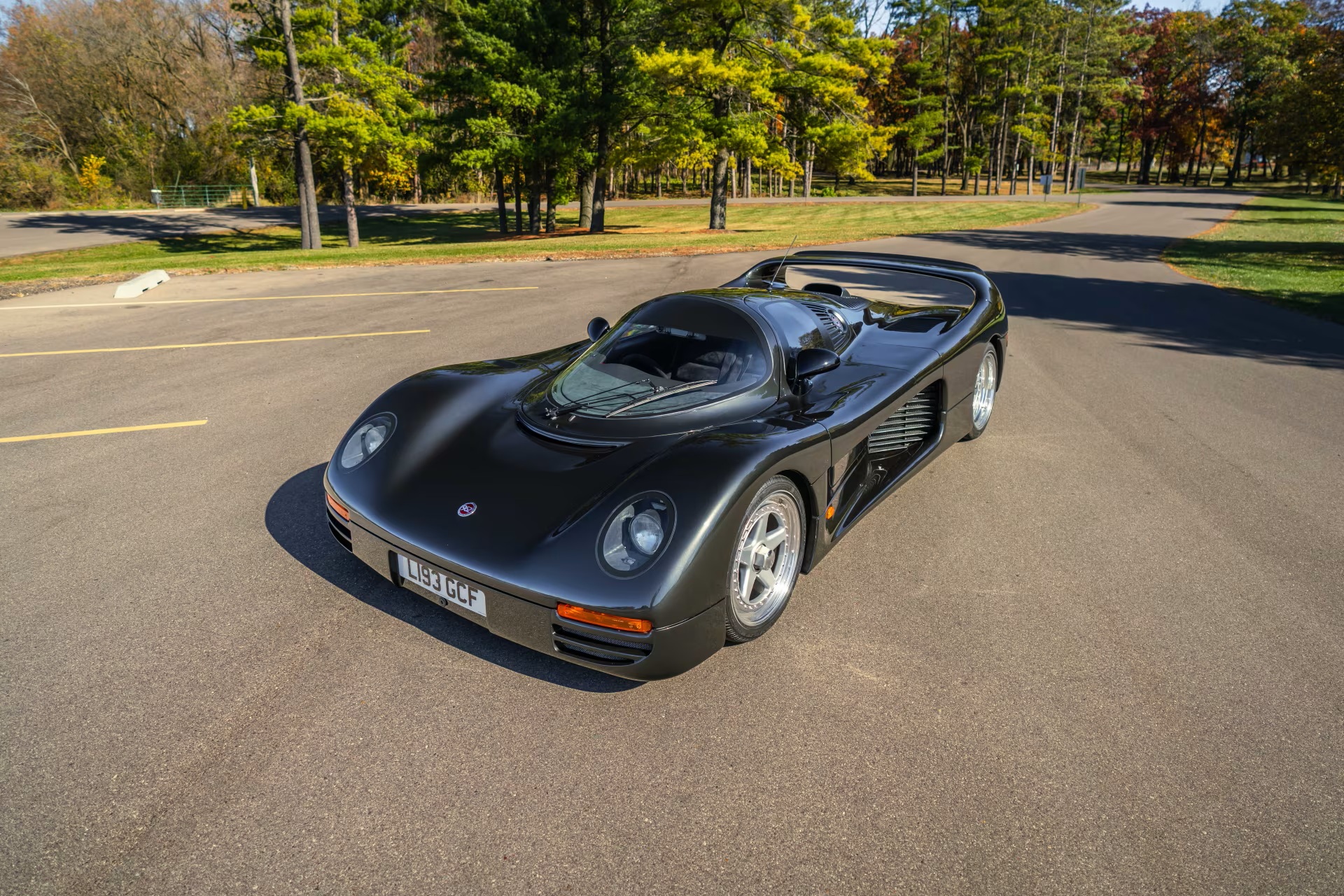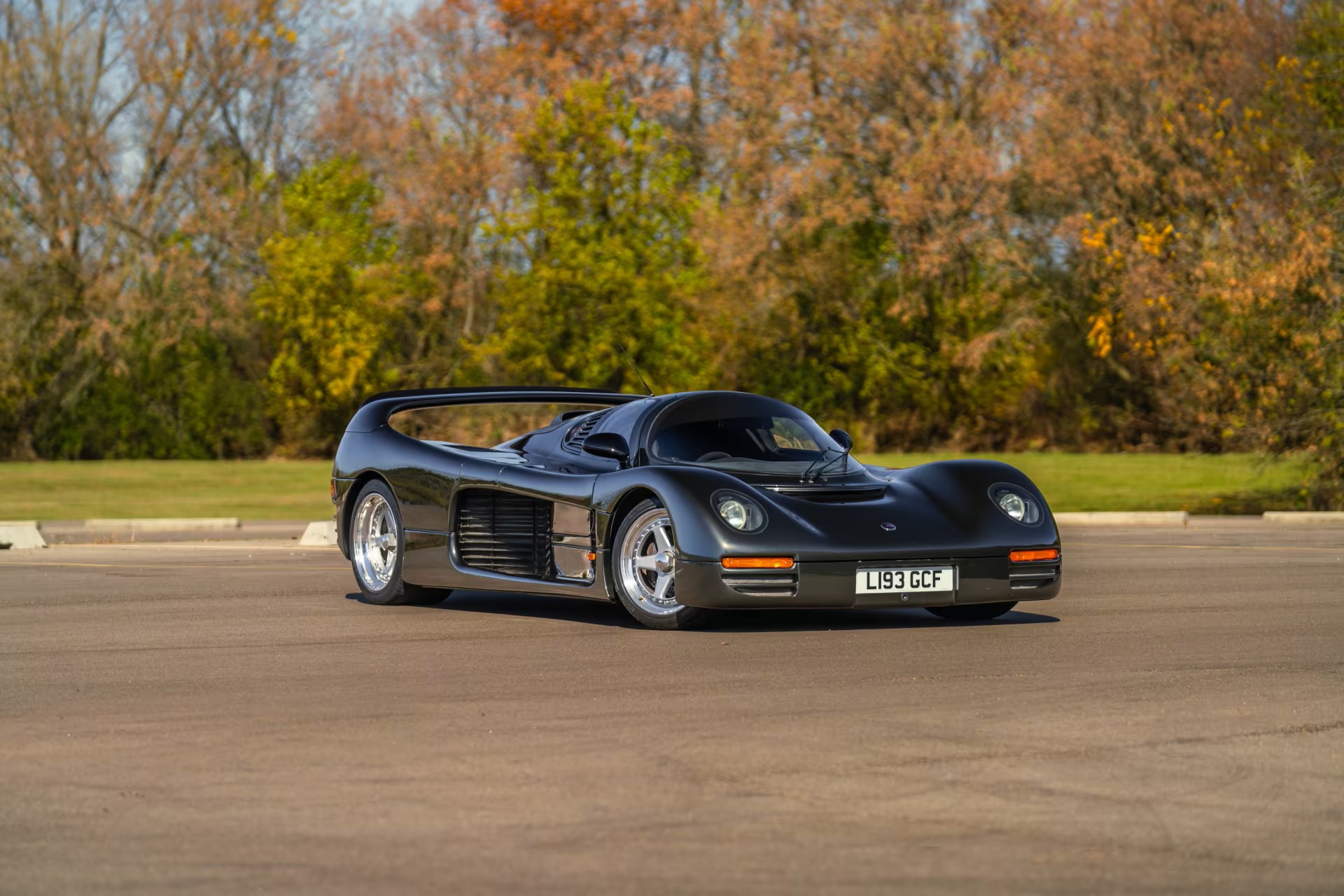 Extensive documentation accompanies the car, including a Vern Schuppan Limited sales brochure, certificate of authenticity, provenance declaration, U.K. registration document, and MOT certificates. It retains its original black-on-black color scheme with Michael Simcoe’s 959-inspired design and Reynard’s wider carbon fiber chassis.