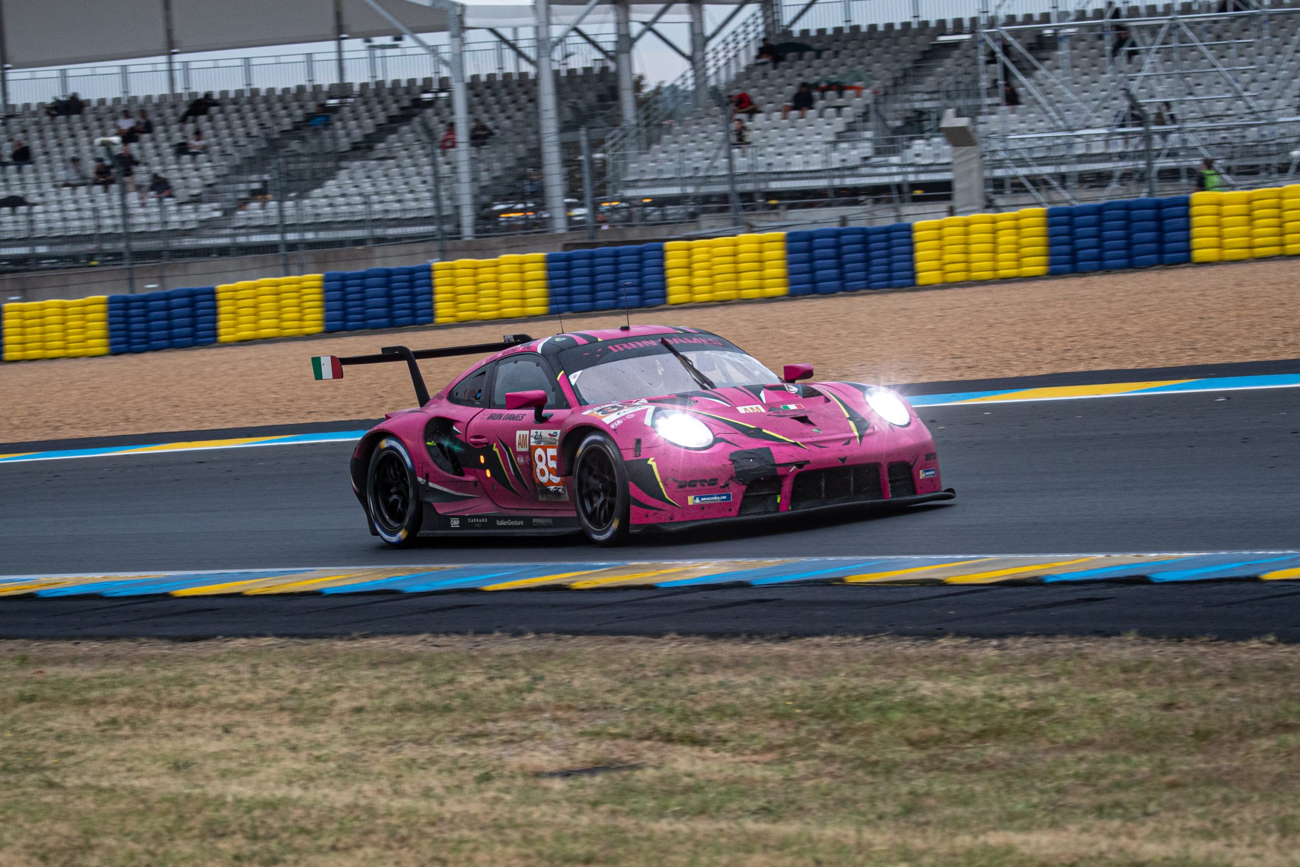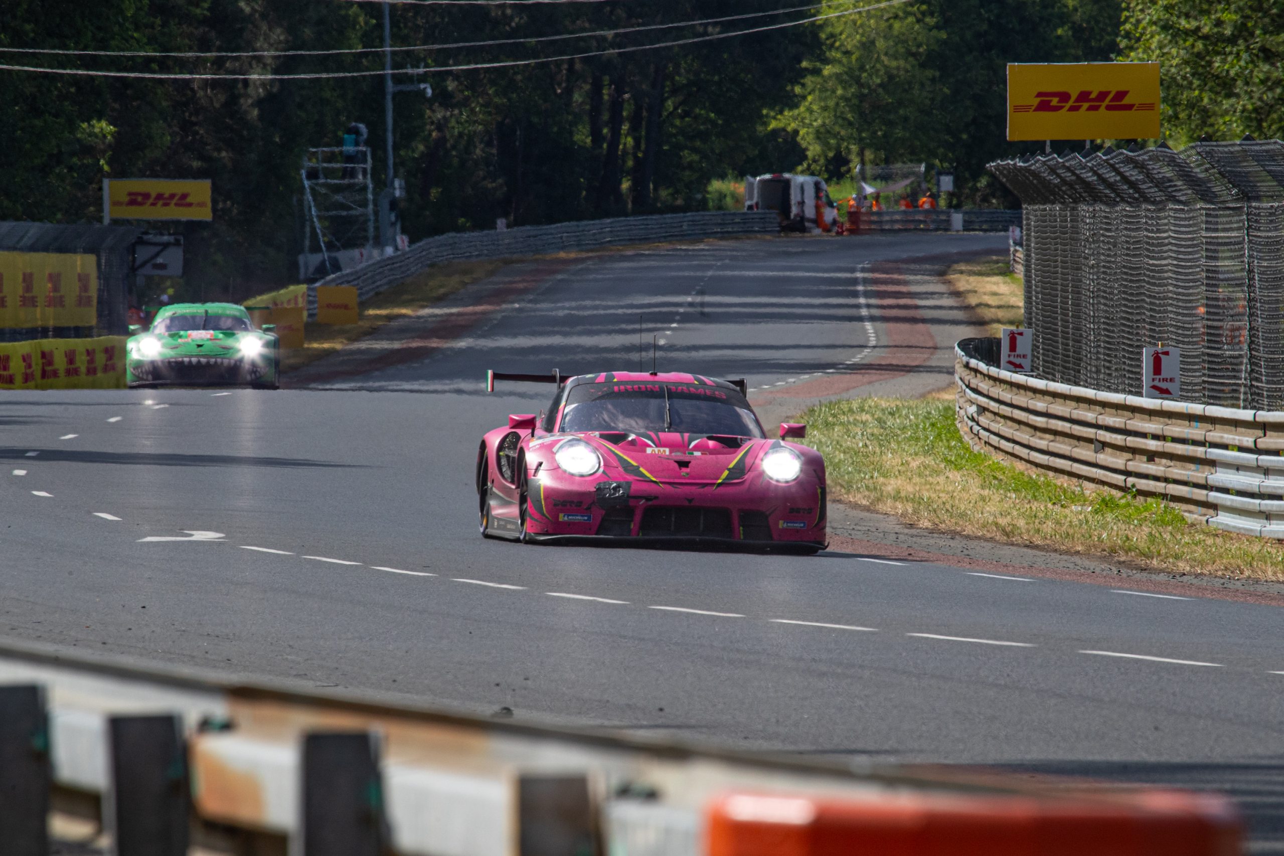 As I waited for the No. 85 car to come around again, I was shocked to see that the car had no lights showing on its flank. The Corvette showed one light, and the Aston Martin showed two lights, but then came the No. 86 GR Racing Porsche with three lights, which meant that something had happened while I was walking to my position. Unbeknown to me, a final pitstop for a change of brakes in the 24th and decisive hour, had dropped the Dames back to fourth place, losing track position to the No. 86 GR Racing Porsche.
