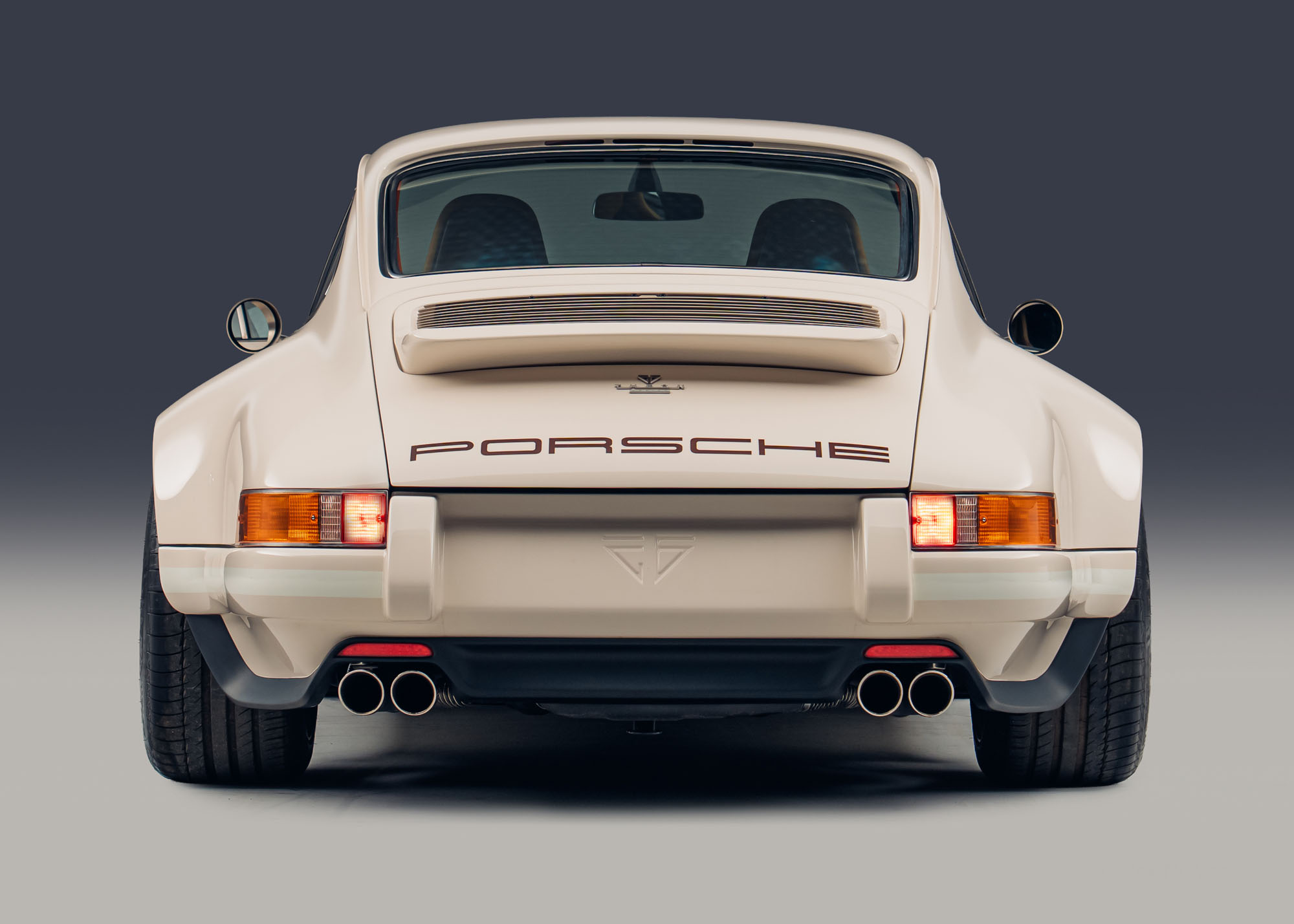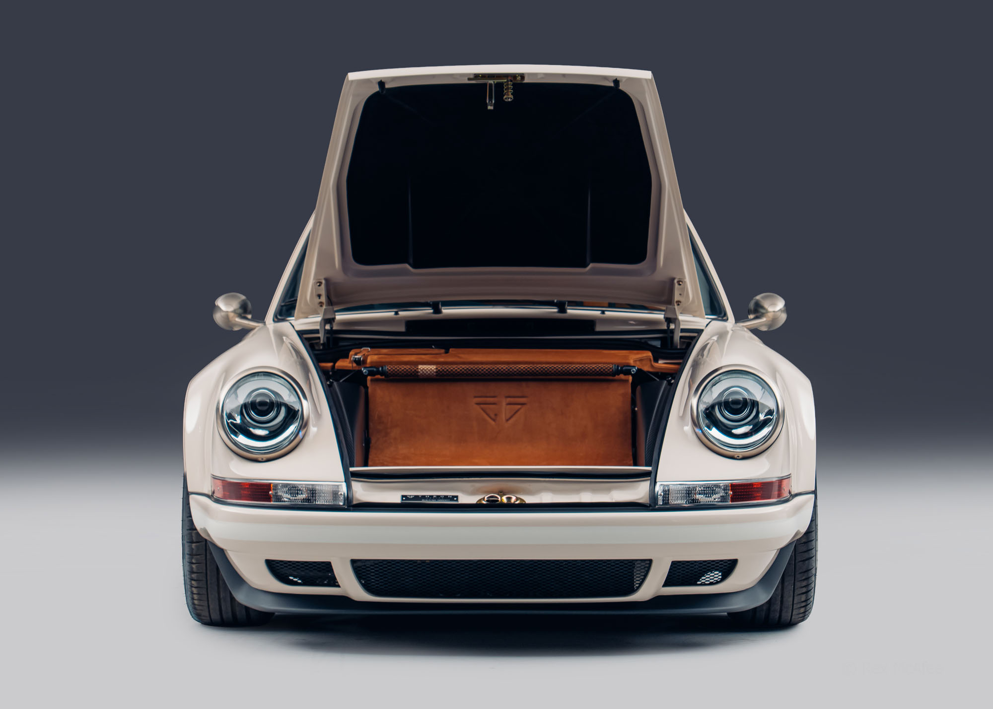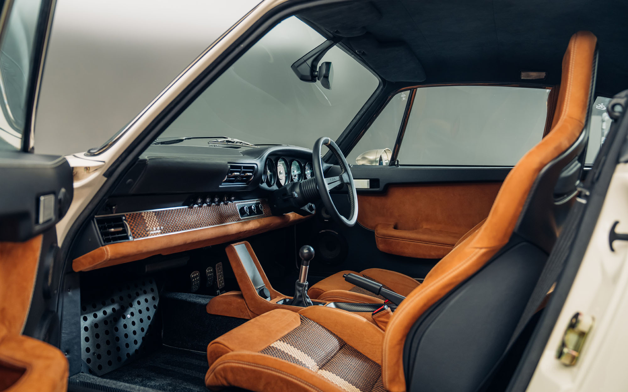 Theon Design Co-Founder Adam Hawley explains: “Our latest commission, built for a British customer is a refined, timeless take on our air-cooled 911 recipe. The client wanted to create a 911 that spoke softly – classically elegant to look at and subtle to the untrained eye – but carried a big stick; this build has performance to keep a 992 GT3 honest on a twisty road. The ‘Medium Ivory’ paint with Grand Prix White stripes and Copper Brown Metallic PORSCHE script harks back to the 1970s whilst also looking entirely contemporary, delivering an understated aesthetic with a dash of motorsport purity, hinting at its performance capabilities.