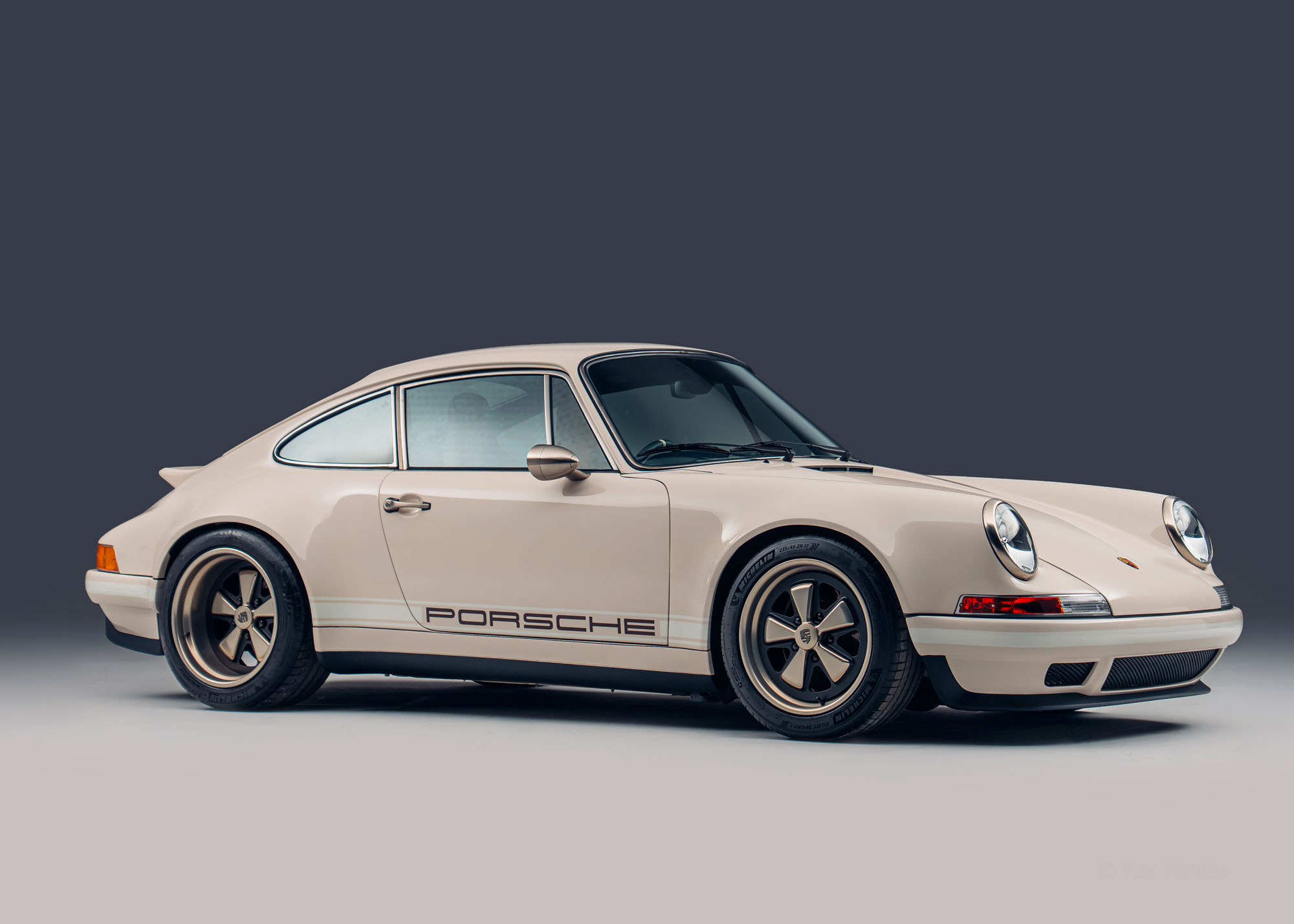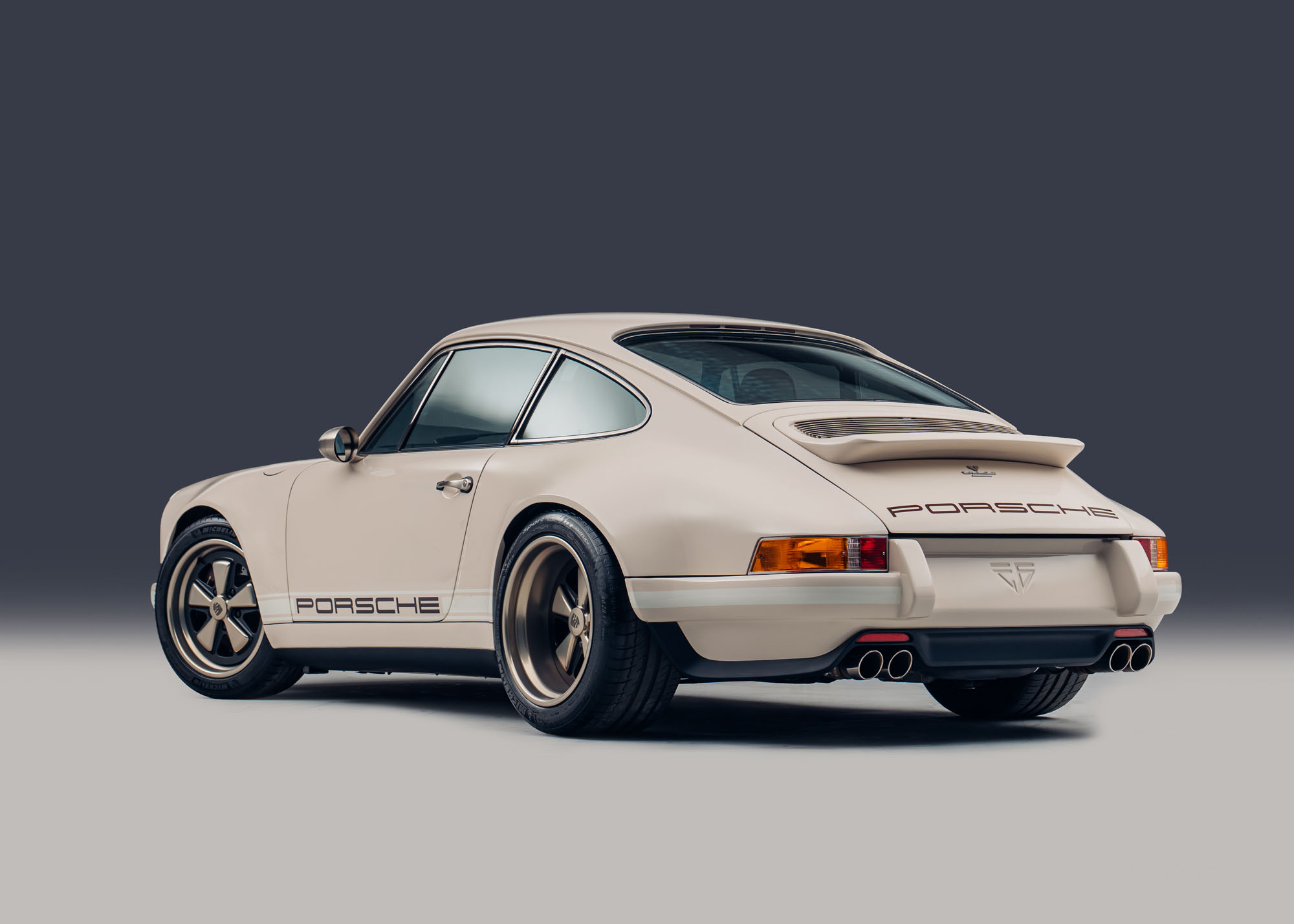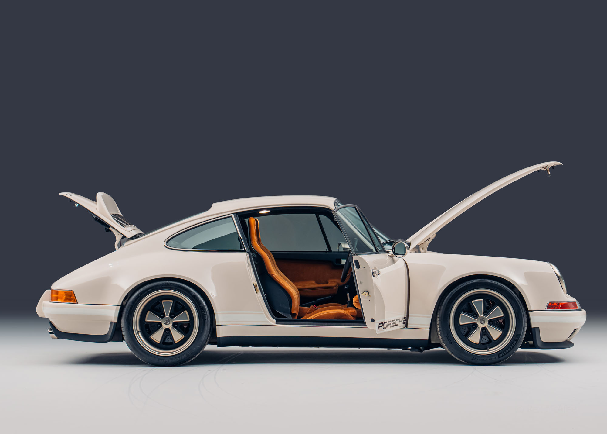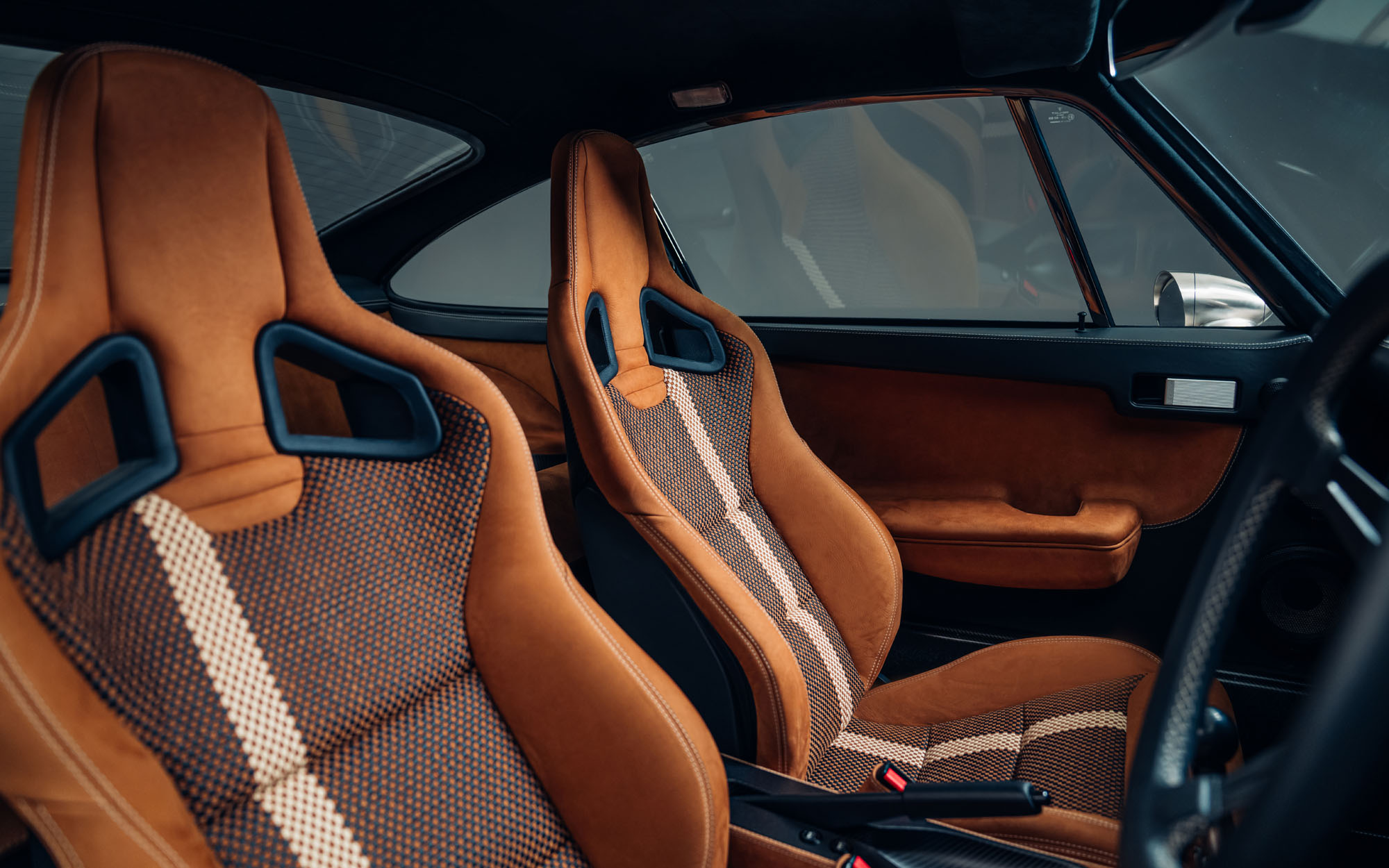 Theon Design Co-Founder Adam Hawley explains: “Our latest commission, built for a British customer is a refined, timeless take on our air-cooled 911 recipe. The client wanted to create a 911 that spoke softly – classically elegant to look at and subtle to the untrained eye – but carried a big stick; this build has performance to keep a 992 GT3 honest on a twisty road. The ‘Medium Ivory’ paint with Grand Prix White stripes and Copper Brown Metallic PORSCHE script harks back to the 1970s whilst also looking entirely contemporary, delivering an understated aesthetic with a dash of motorsport purity, hinting at its performance capabilities.