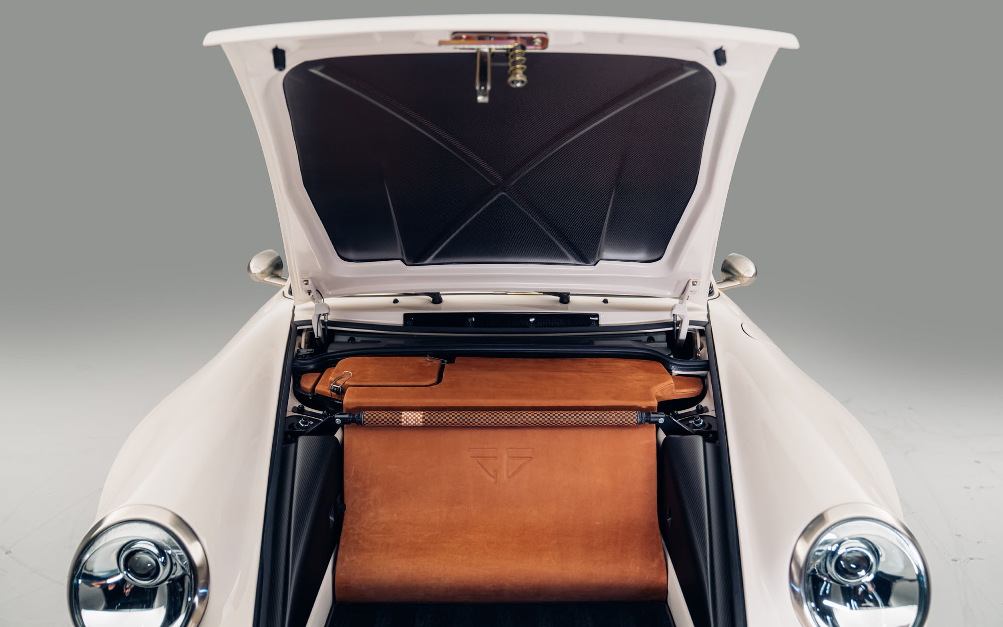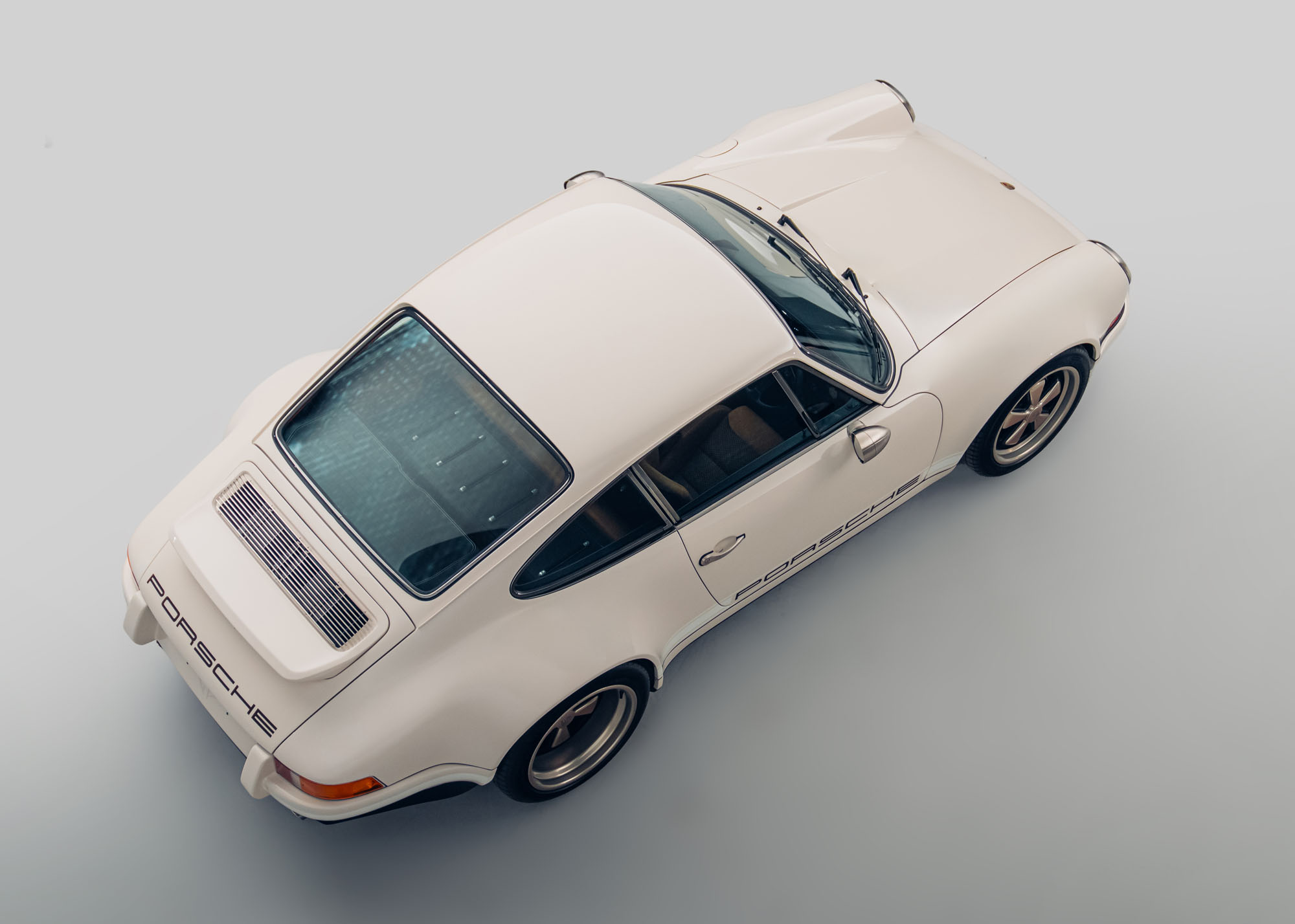 The build features other carefully integrated aesthetic details which elevate the whole. There is matching champagne detailing for the wheels, rear-engine cover grille, mirrors and headlight rings, while the glasshouse brightwork features Theon’s contemporary Polished Eclipse Chrome finish. Distinctive Copper Brown metallic brake calipers add a further dash of color, matching the painted text of elegant PORSCHE script on the doors and engine lid, and gently evoking a ‘70s aesthetic. The calipers are nestled behind bespoke 17-inch Fuchs-style wheels, which are lightweight three-piece split rims finished in champagne, filling the sculpted arches perfectly. The result is a cohesive, beautifully resolved machine that combines classic minimalist elegance with modern performance capability.