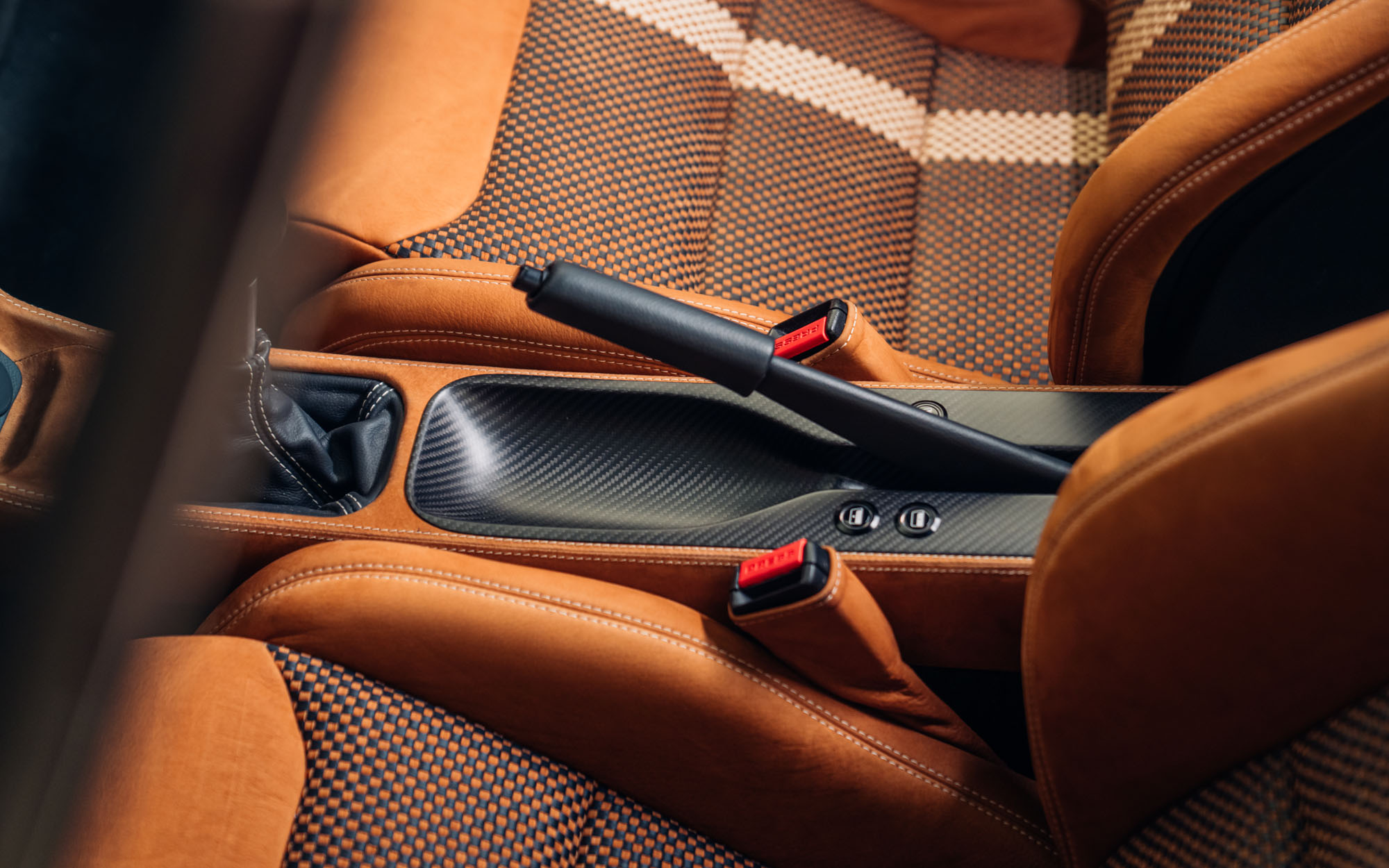The car has been specced with Theon’s sporting Recaro CS seat option which strikes a fine balance between support and touring comfort. The seats feature satin carbon fibre backs and distinctive woven leather centers combining the Tobacco and Licorice tones with contrasting Ivory stripes; even the belt holes and tilt handles are trimmed in rich Licorice leather. The dashboard features a matching woven leather insert stretching across its face, creating visual cohesion throughout the cabin.
