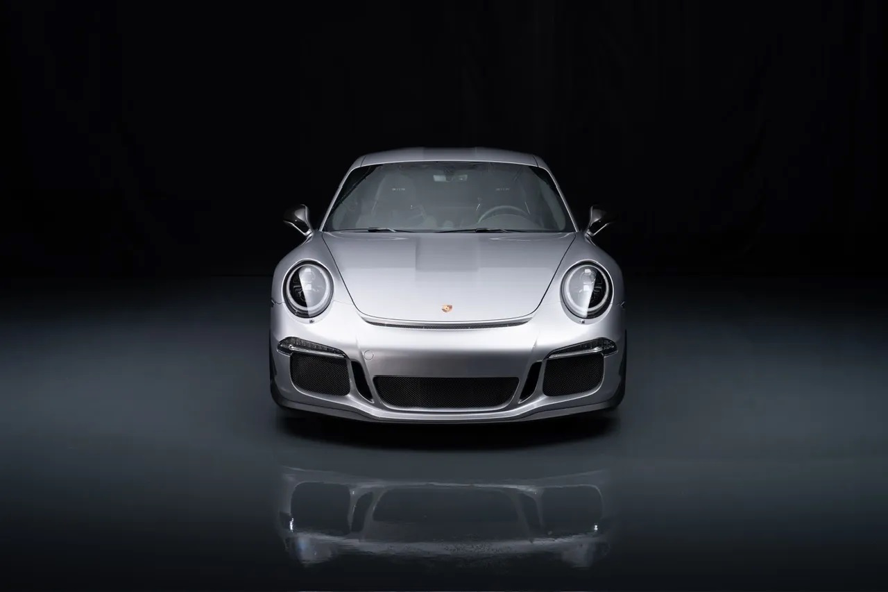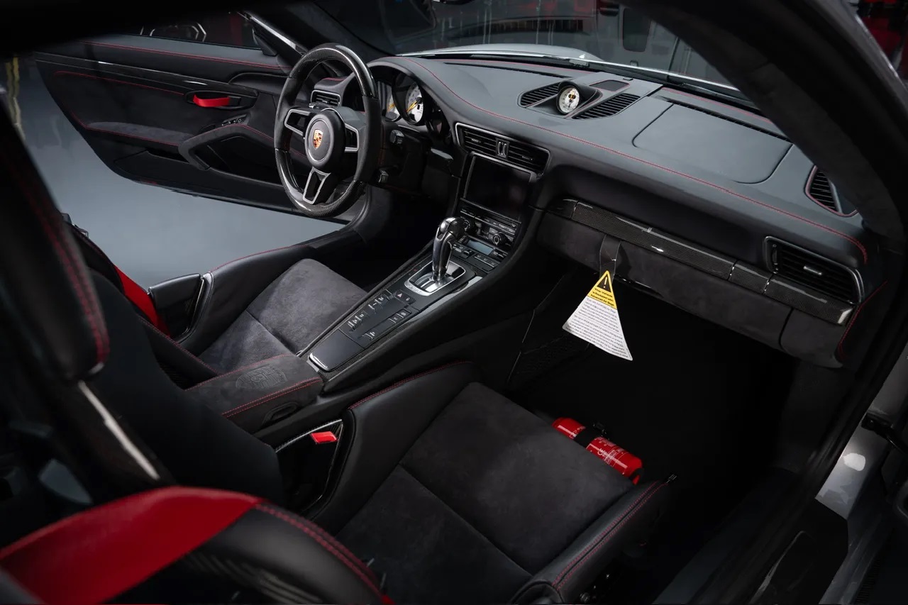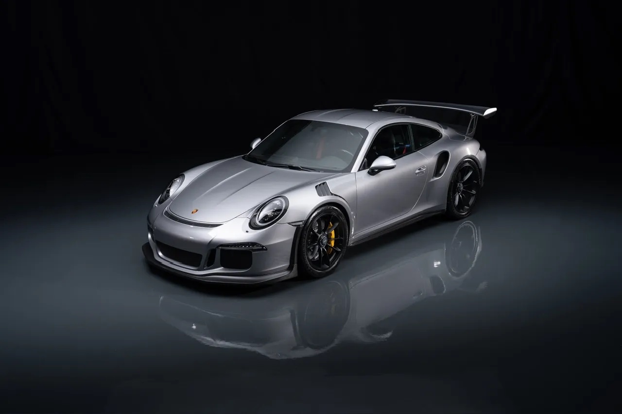 This 2016 Porsche 911 GT3 RS is finished in GT Silver Metallic with a black leather and Alcantara interior featuring red deviated stitching, customized through Porsche’s Special Wishes program. It is powered by a 4.0-liter flat-six engine paired with a seven-speed PDK dual-clutch transaxle.