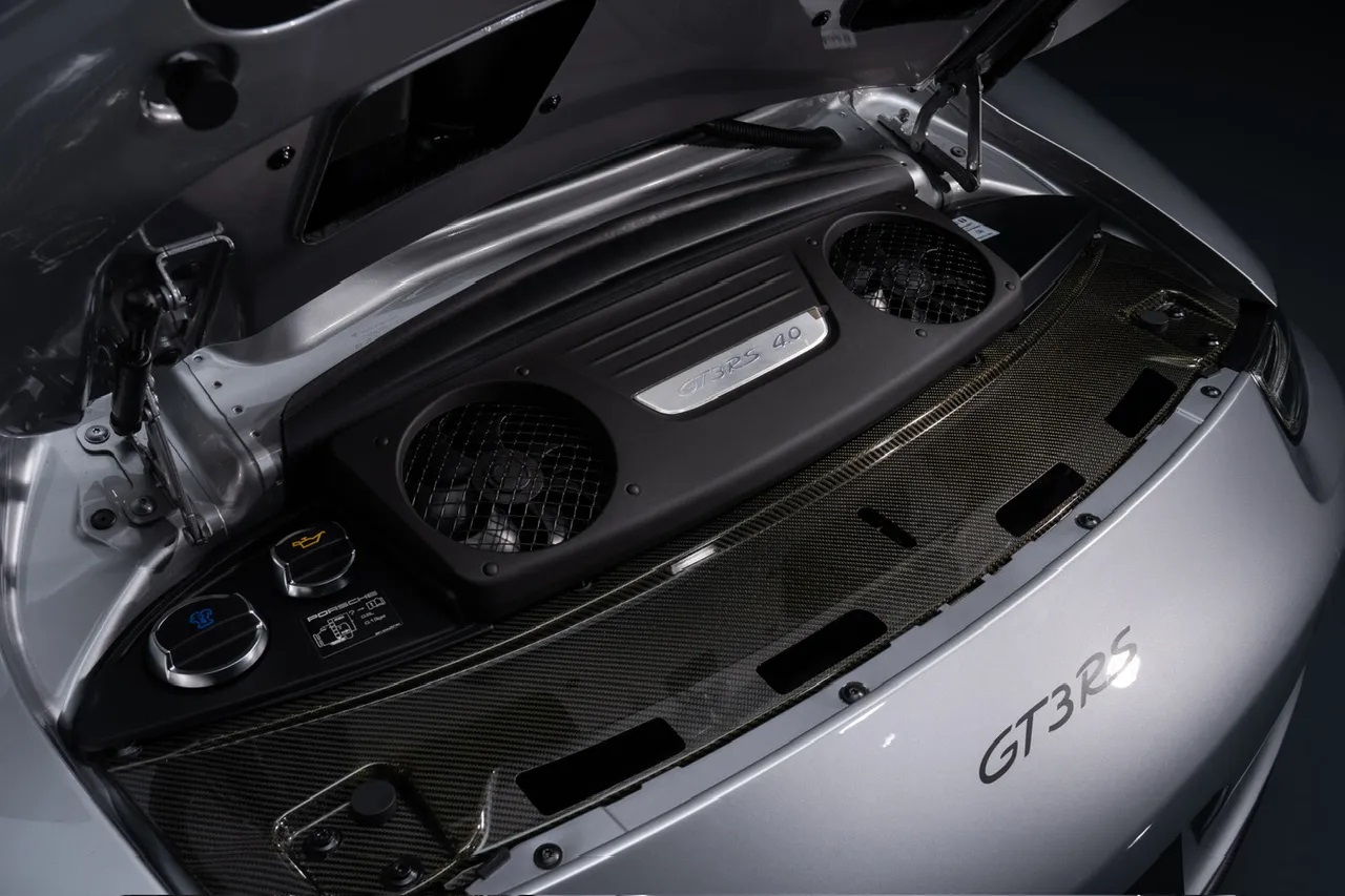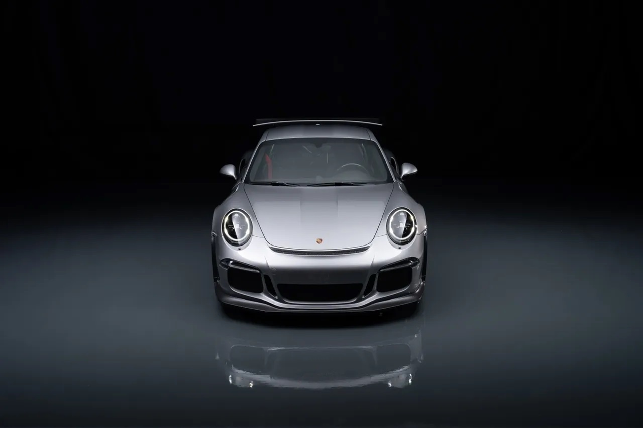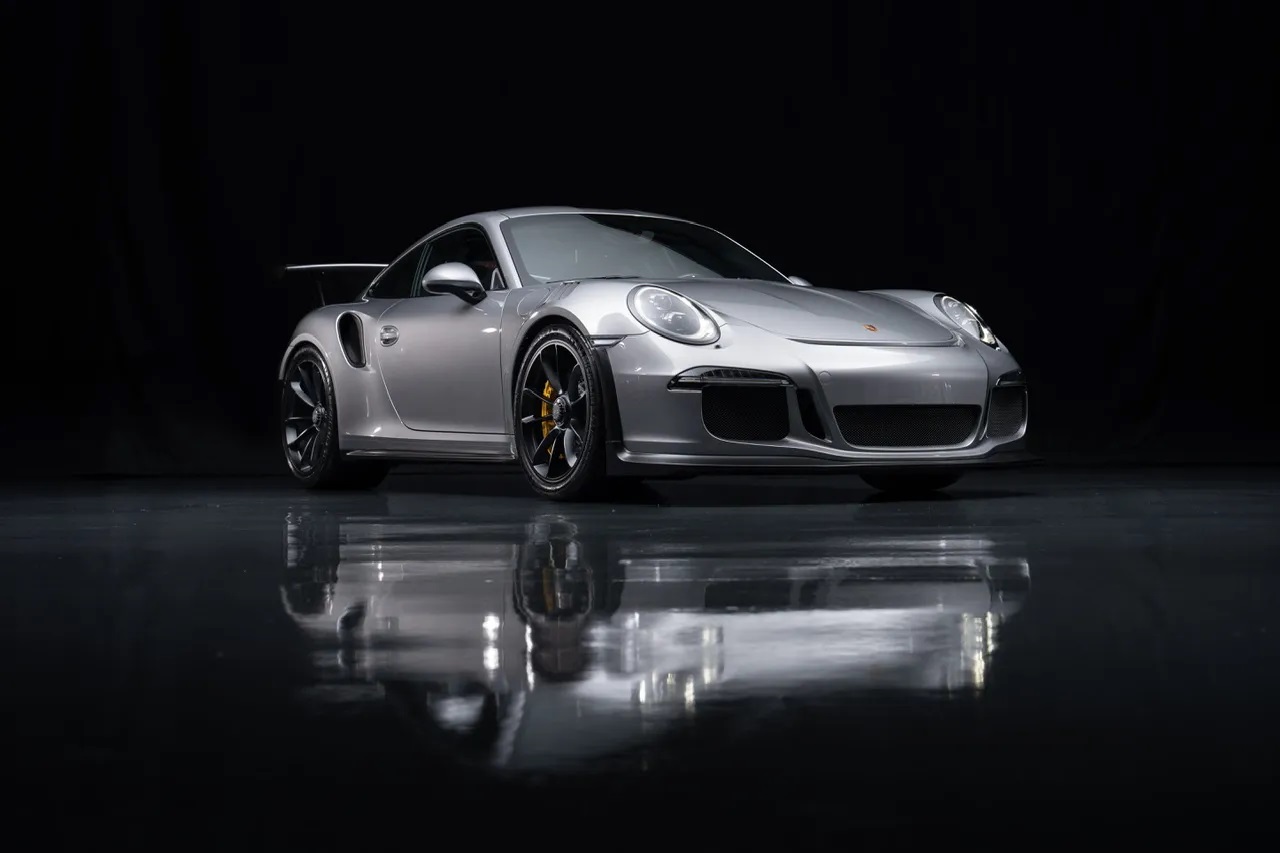 This 2016 Porsche 911 GT3 RS is finished in GT Silver Metallic with a black leather and Alcantara interior featuring red deviated stitching, customized through Porsche’s Special Wishes program. It is powered by a 4.0-liter flat-six engine paired with a seven-speed PDK dual-clutch transaxle.