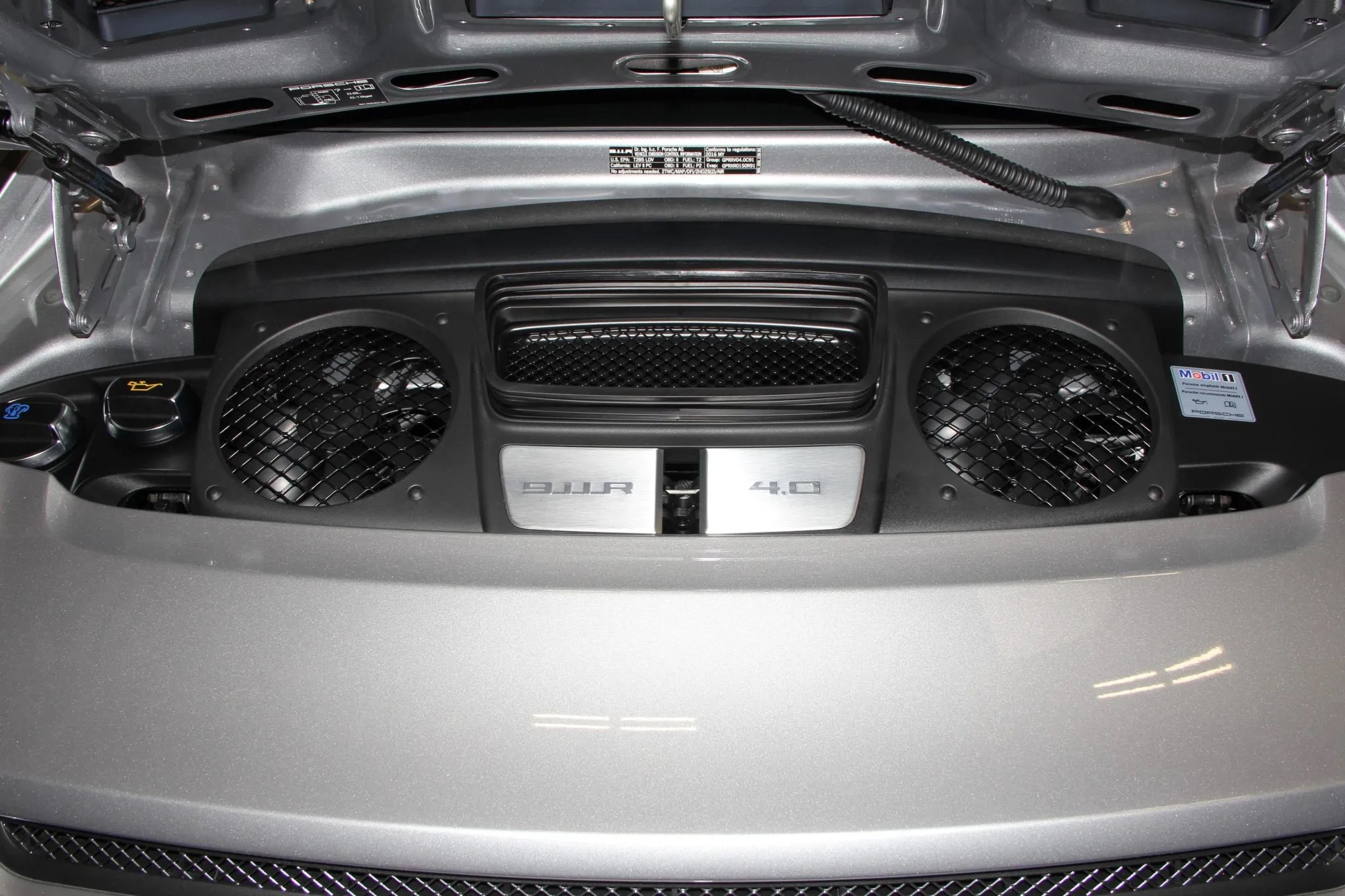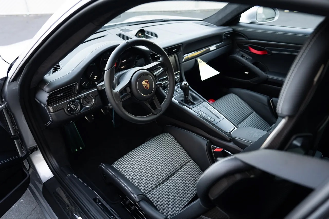 This 2016 Porsche 911 R, number 826 of 991 produced in a single model year, has just 14 miles on the odometer. It is powered by a 4.0-liter flat-six engine delivering 500 horsepower and 339 lb-ft of torque, paired with a six-speed manual transaxle and a limited-slip differential. The car is finished in GT Silver Metallic with a black leather and Pepita cloth interior.