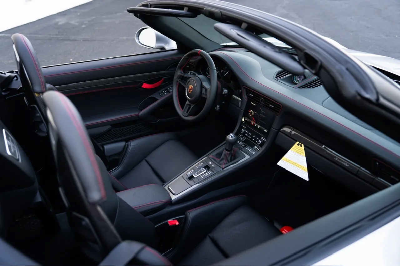 The vehicle is equipped with 20″ GT3 center-lock alloy wheels, carbon-ceramic brakes, a limited-slip differential, a front-axle lift system, a black soft top, and a carbon-fiber twin-hump convertible-top cover panel. Inside, the car features the Chrono and Light Design Packages, extended black leather with red deviated stitching, carbon-fiber trim, a Bose surround sound system, and carbon-fiber full bucket seats.