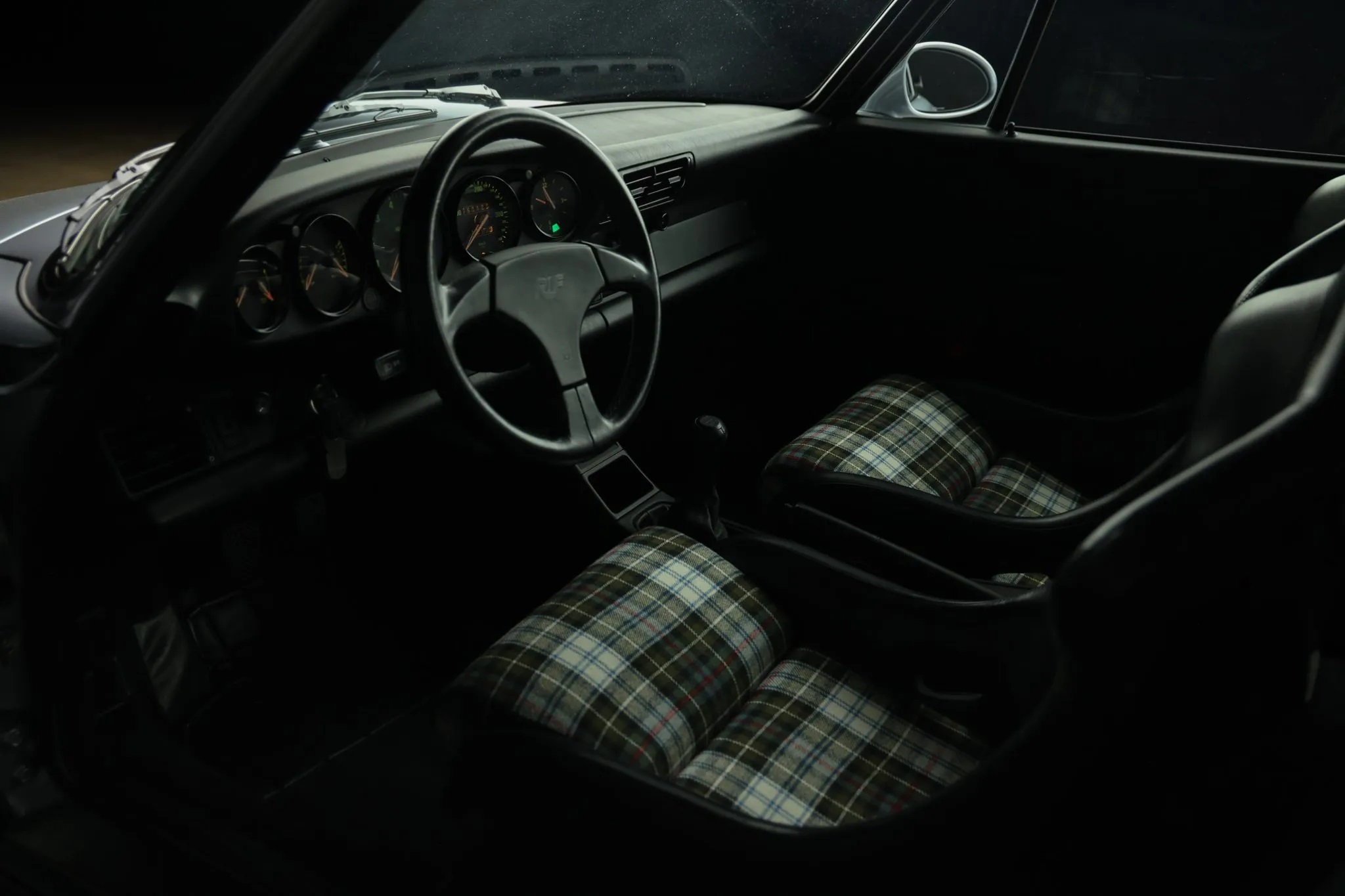 The Polar Silver Metallic exterior is complemented by black leather and tartan cloth upholstery together with manual crank windows, a Blaupunkt Montreux stereo, and green-letter VDO gauges.. Signature RUF touches include rolled fenders, an aluminum hood, the iconic “whale-tail” spoiler, 18-inch RUF/Speedline wheels, and upgraded suspension and brakes.