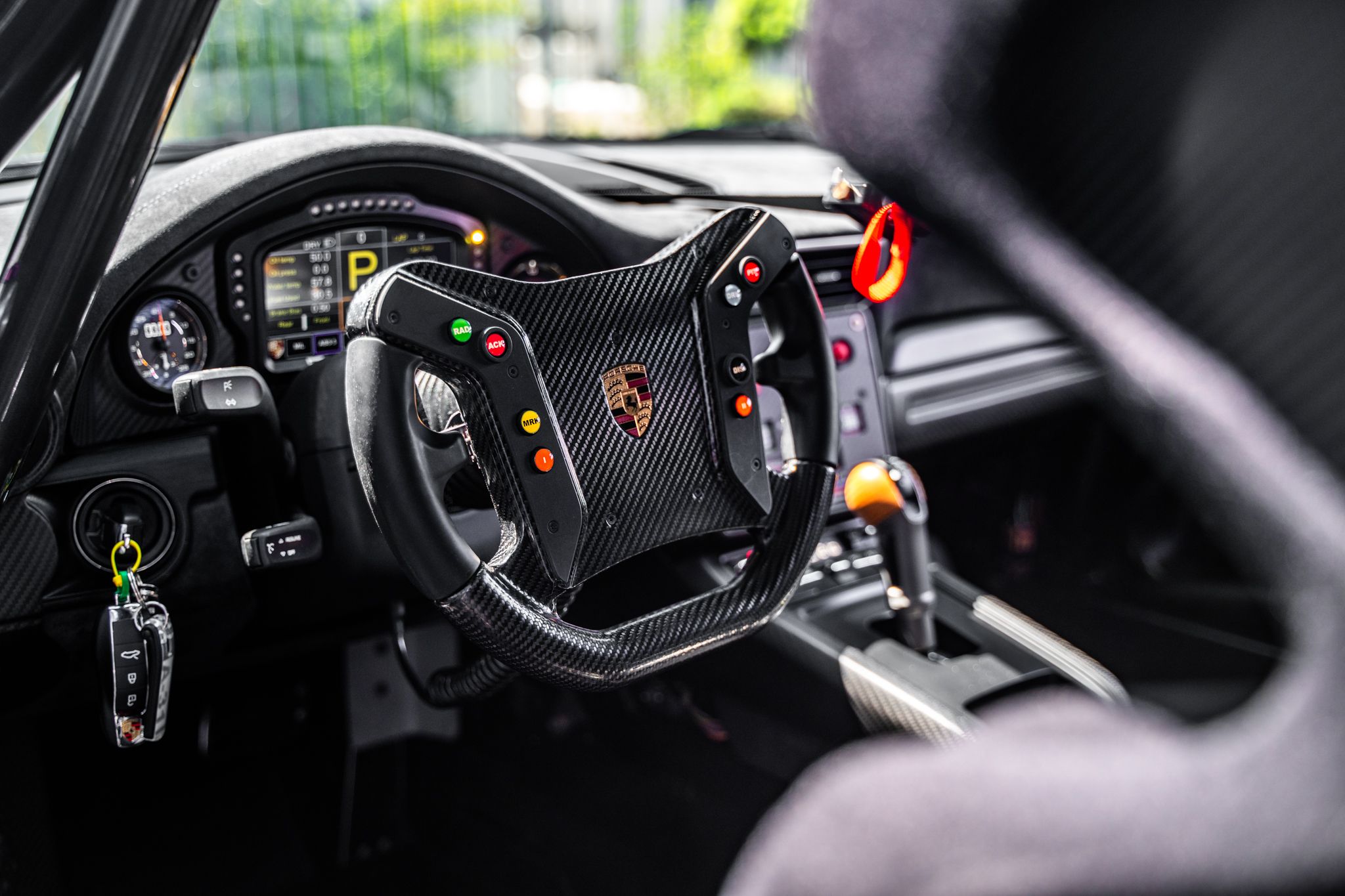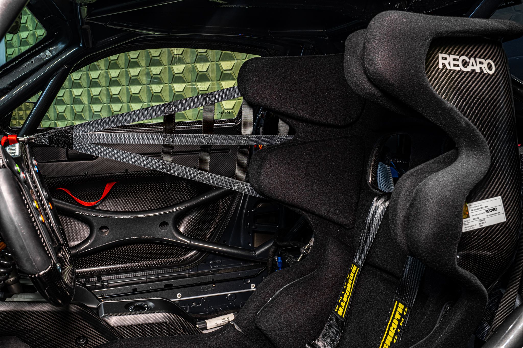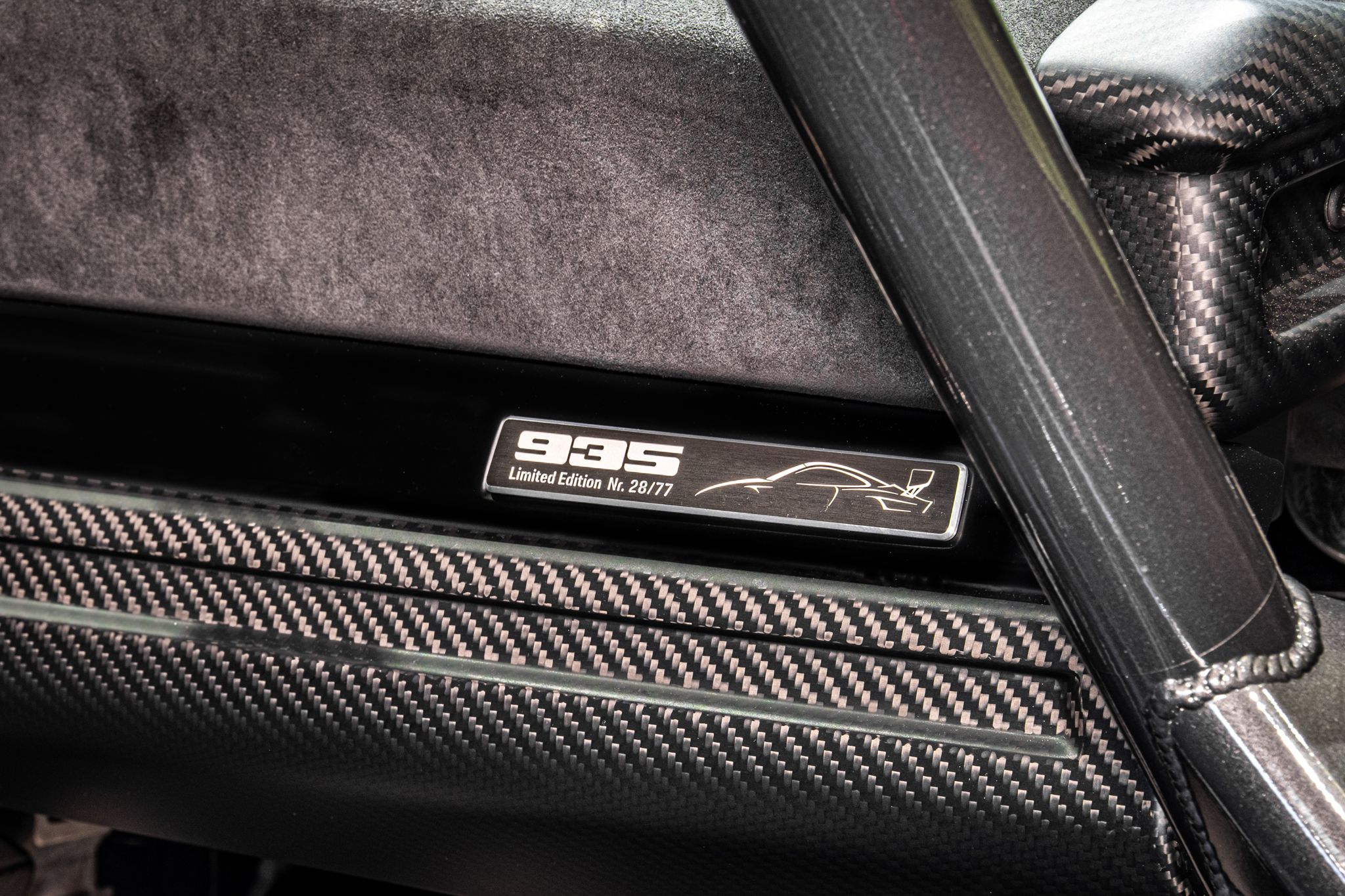 Originally specified in matte black, the 935 includes lightweight hybrid aluminum steel chassis, CFRP bodywork, and a large CFRP rear wing. Safety features are extensive, including a fully integrated roll cage, 115-liter fuel cell, and three on-board air jacks. The car also boasts advanced aerodynamics and cooling systems, with LED headlights and rear lights, FIA rain light, and electronically-adjustable mirrors.