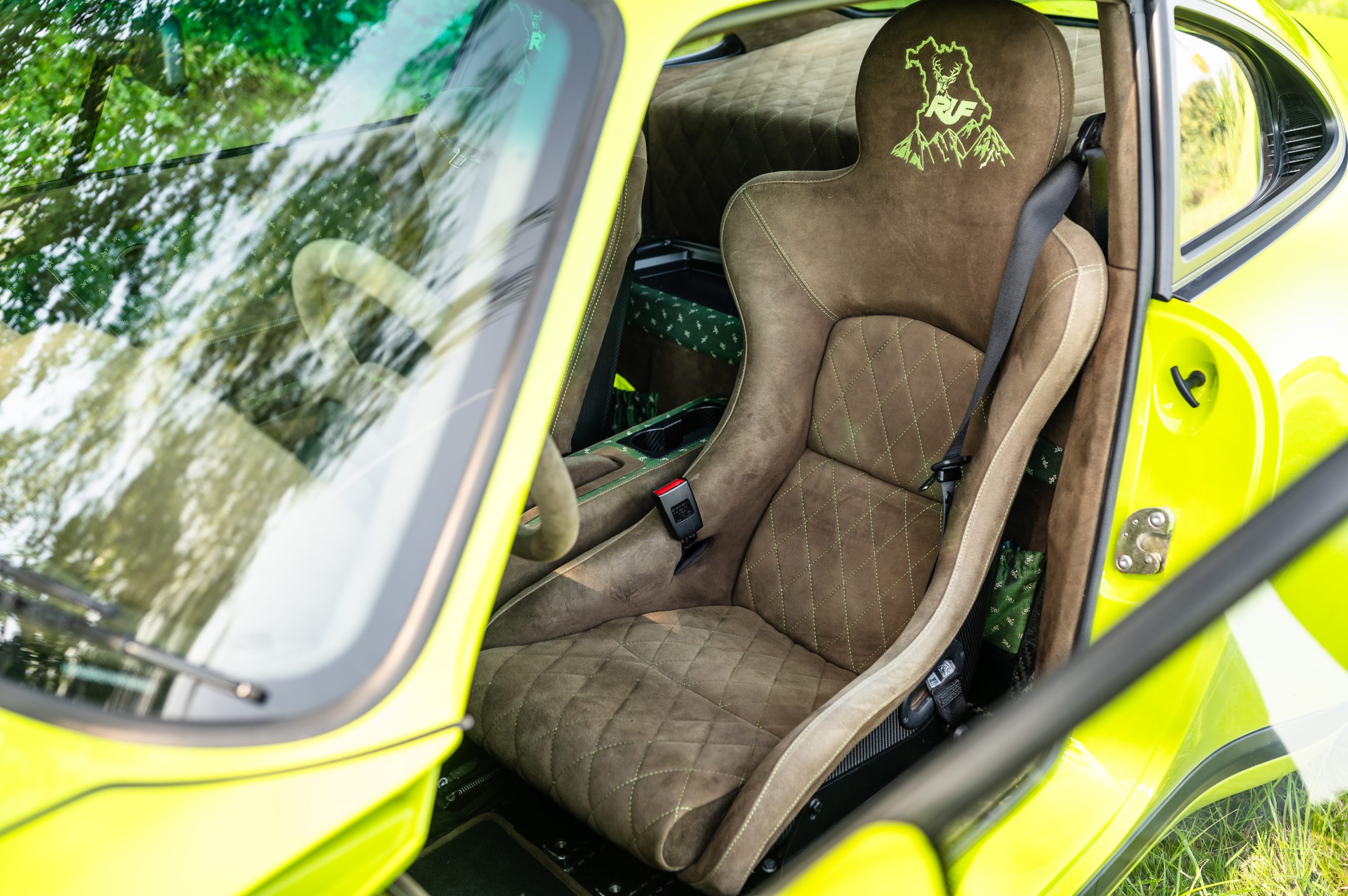 This example is finished in Light Green over a bespoke brown deerskin interior. Its interior features bespoke embroidery of the RUF logo, a mountain scene, a stag’s head, and the outline of Bavaria, all matching the exterior color. Equipped with a variable exhaust system and front axle hydraulic lifter, it includes extras like a lightweight battery, fire extinguisher, and original books.