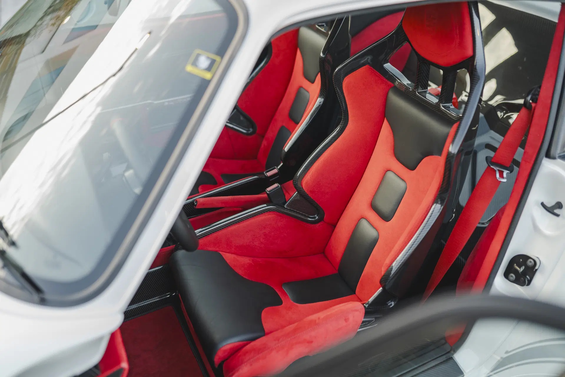 The interior is a luxurious mix of carbon fiber, red Alcantara, and black leather, with carbon fiber bucket seats providing excellent support. The 4.0-liter Rothsport engine is coupled with a custom Getrag G50 6-speed transaxle, and the suspension is expertly tuned with KW Clubsport coilovers.