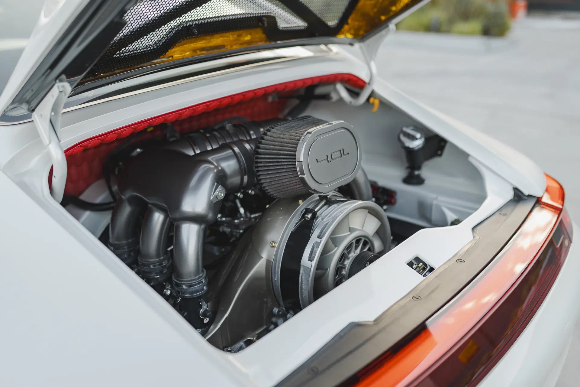 The Gunther Werks 400R, which debuted in 2017, features a bespoke wing and special carbon fiber bodywork, with extended fenders accommodating larger tires. These are necessary for the 4.0-liter naturally aspirated flat-6 engine built by Rothsport Racing, which produces 400 horsepower and 330 pound-feet of torque, revving up to 7,800 rpm. A custom six-speed manual transmission by Getrag is designed specifically for the 400R.
