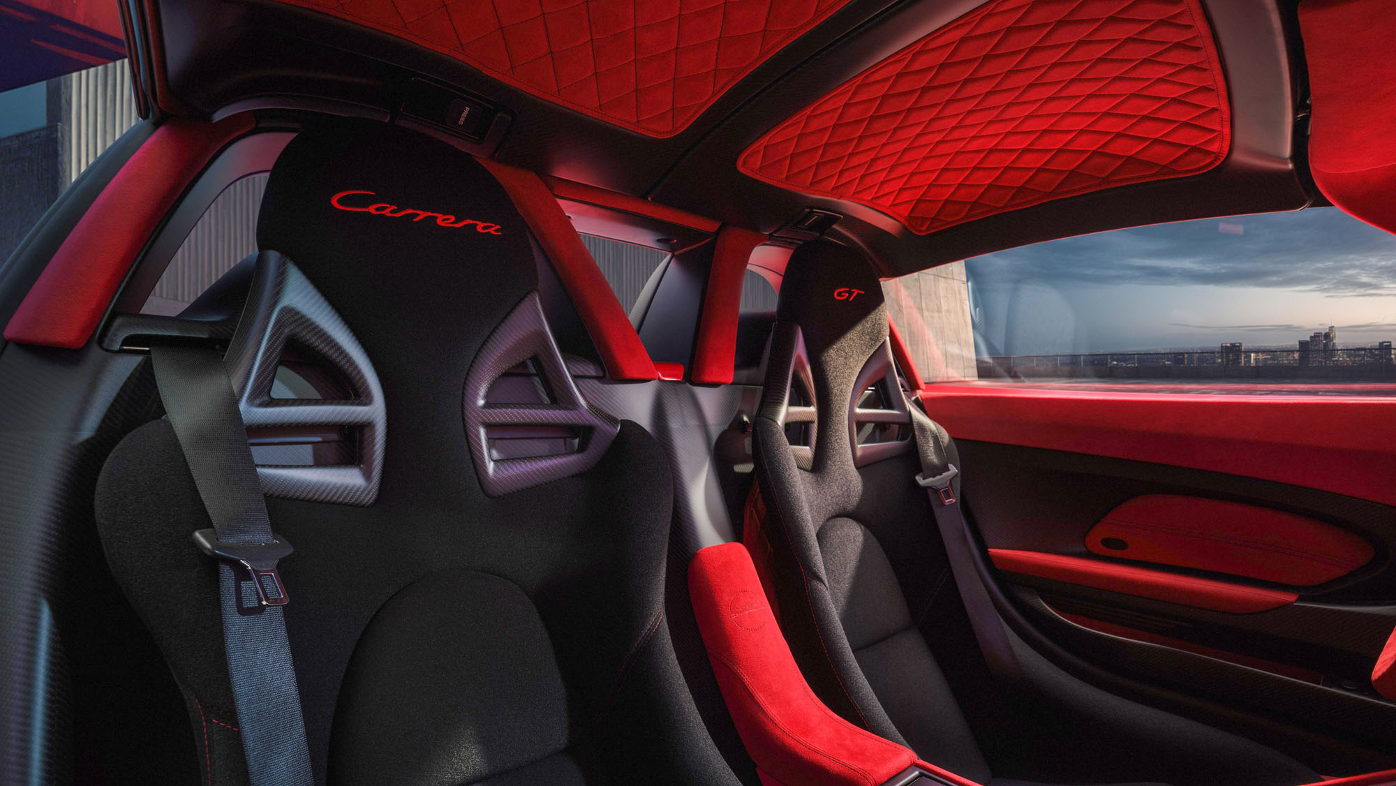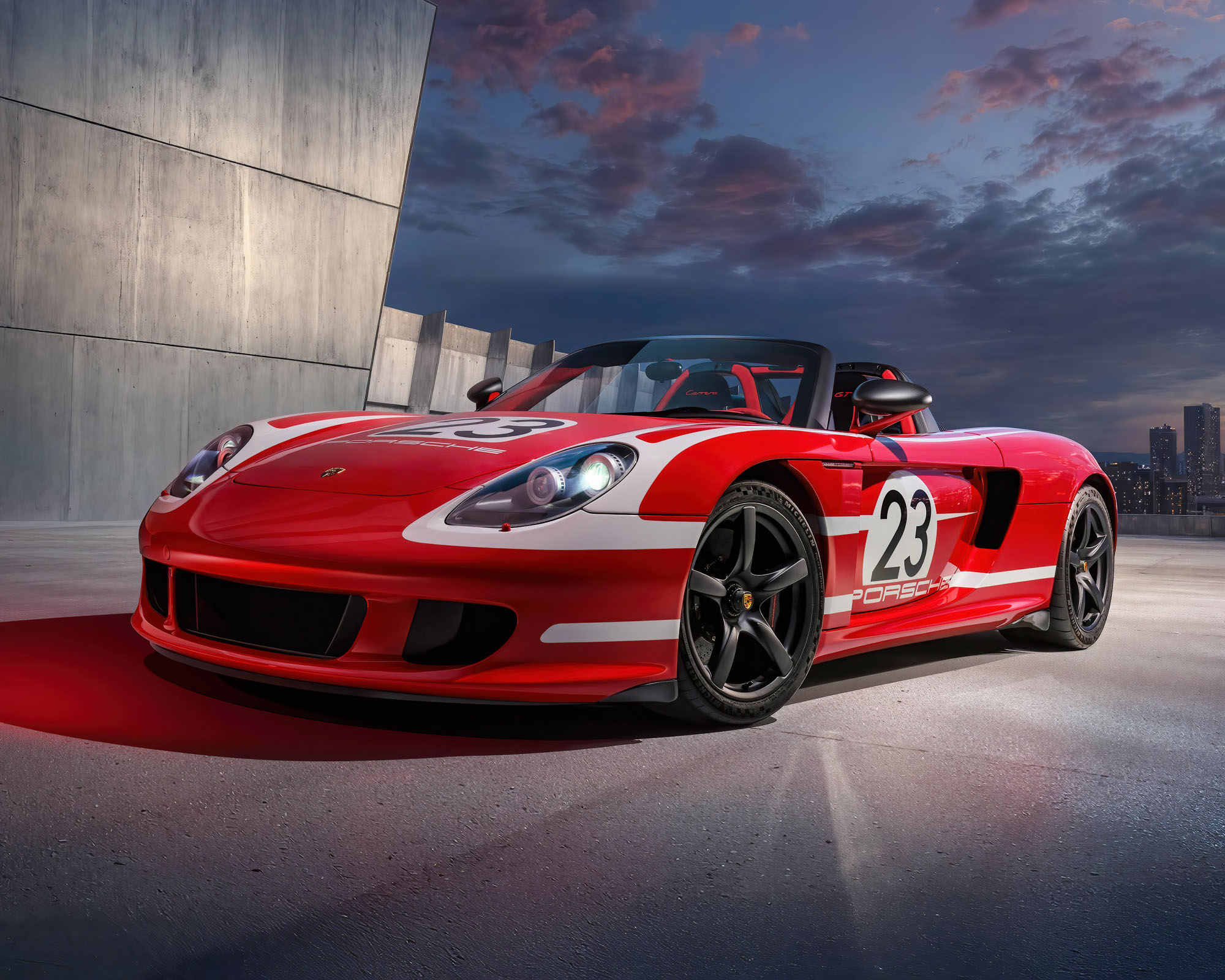 When the Carrara GT was launched in 2003, it was one of the fastest production vehicles in the world, with a top speed of 330 km/h. The carbon fiber chassis and the centrally located engine are based on thoroughbred racing technology. Porsche originally developed the naturally aspirated V10 engine for use in the 24 Hours of Le Mans. In the Carrera GT, the displacement is 5.7 liters. Its output of 450 kW (612 PS) meets a curb weight of only 1,380 kilograms.