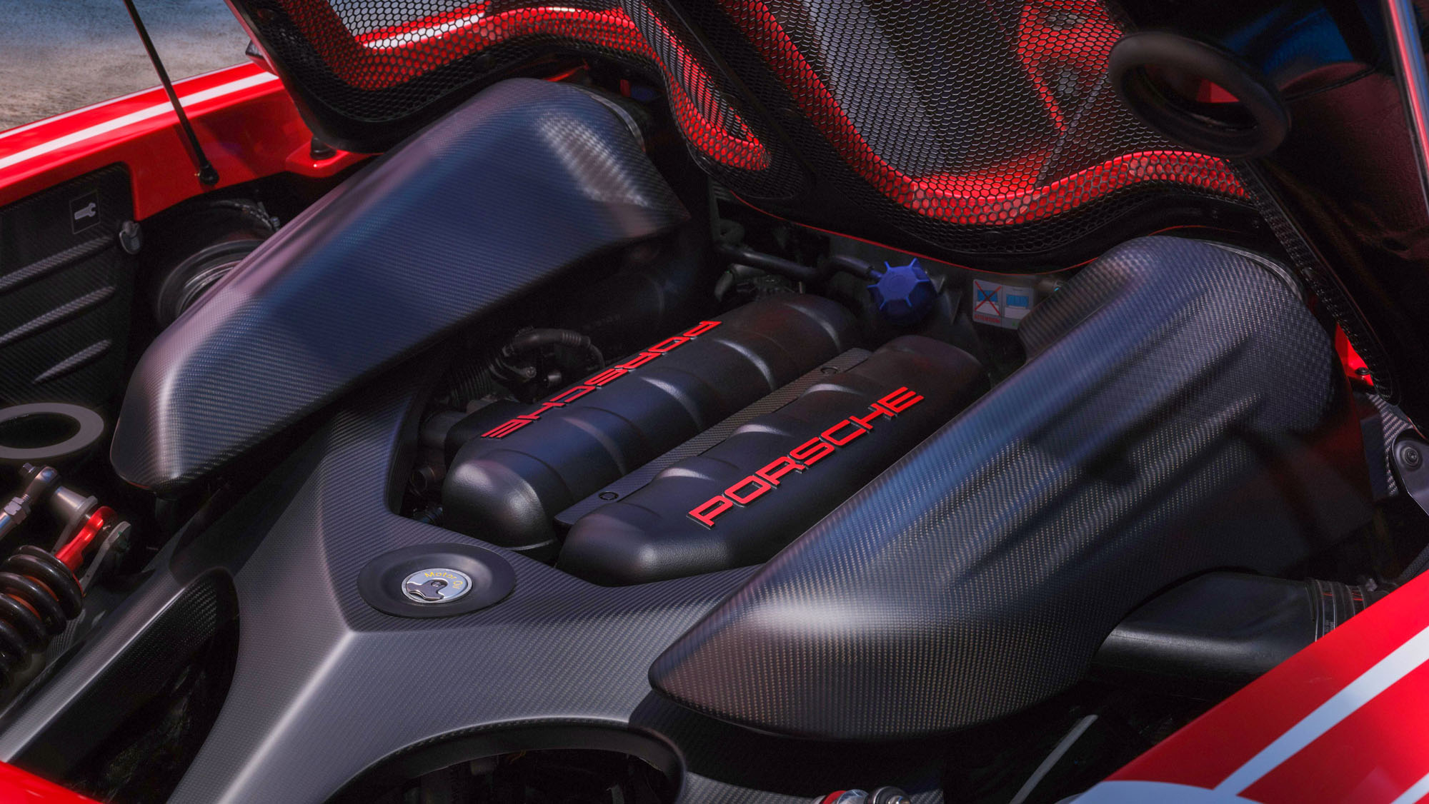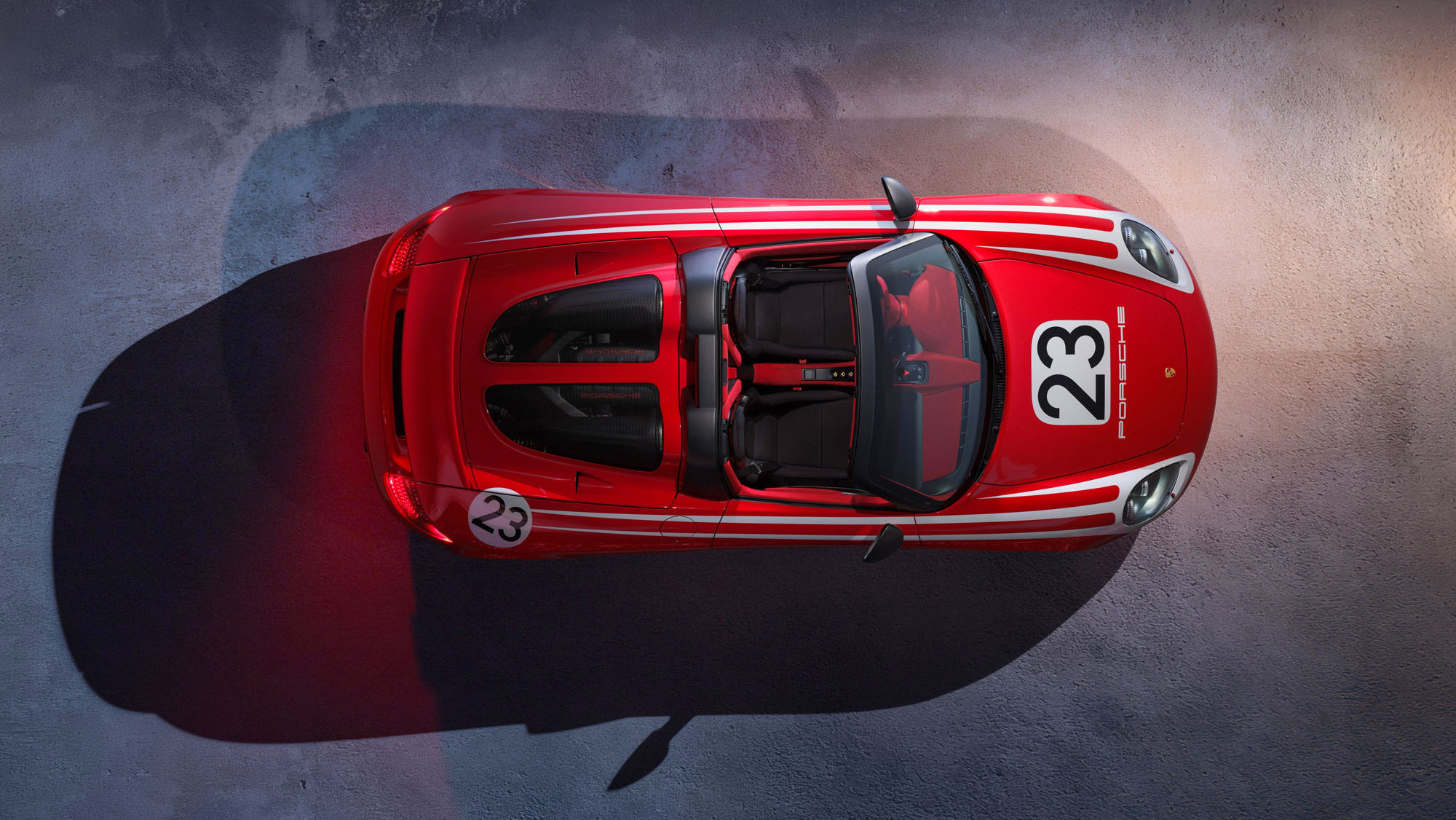 The individual look also includes matt black carbon, which contrasts with the red and white paintwork. It is used, among other things, for the roof halves, the A- and B-pillars, the caps of the exterior mirrors, the air duct in the front section, and the diffuser at the rear. The grilles on the engine cover are black, matt-anodized. The black-painted light-alloy wheels in the original five-spoke design bear a colored Porsche crest.