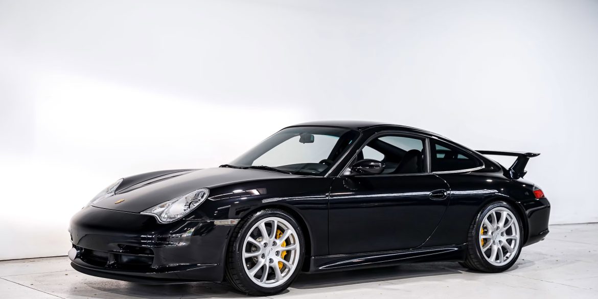 This 2004 Porsche 911 GT3 is presented in Basalt Black Metallic over a full black leather interior and is powered by a 3.6-liter flat-six engine paired with a six-speed manual transmission and a limited-slip differential. Notable features include the Carbon Interior Package, a Porsche CDR23 audio system, power-adjustable sport seats,...