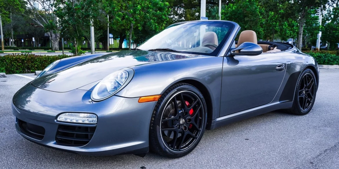 This 2011 Porsche 911 Carrera S cabriolet has 97k miles following registration history in New Jersey, Florida, and Texas. It is finished in Meteor Gray Metallic over Sand Beige leather and is powered by a 3.8-liter flat-six paired with a six-speed manual transaxle. Features include a black soft top, black-finished...